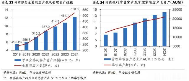 这个道理在之前追踪招商银行的时候也讲过,截至2024年,招行的零售客户数量超过2亿,一共给招行贡献了14万亿左右的资产规模;其中包括VIP金葵花客户523.6万户,贡献了超12万亿的资产规模。换句话说就是,占比2.5%的高净值金葵花客户贡献了超85%的资产规模。