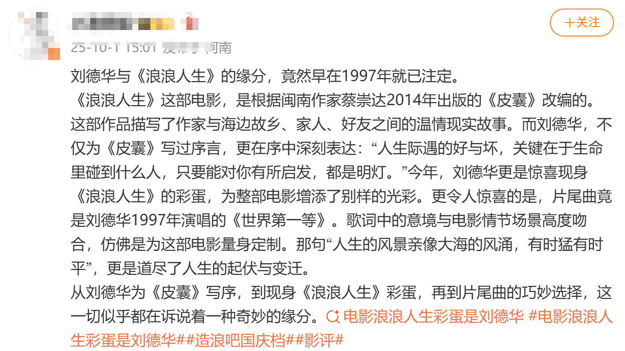 电影浪浪人生彩蛋是刘德华刚刷到《浪浪人生》片尾彩蛋有华仔直接惊到跳起来!经典黑风衣一穿,“神秘大佬”那气场直接拉满,跟范丞丞在码头的对手戏看得我鸡皮疙瘩都起来了!尤其是那句“别怕风浪不出海”,简直戳中人心,瞬间被点燃冲劲!这彩蛋惊喜度直接拉满,晚上电影院必须安排上,《浪浪人生》我来啦!