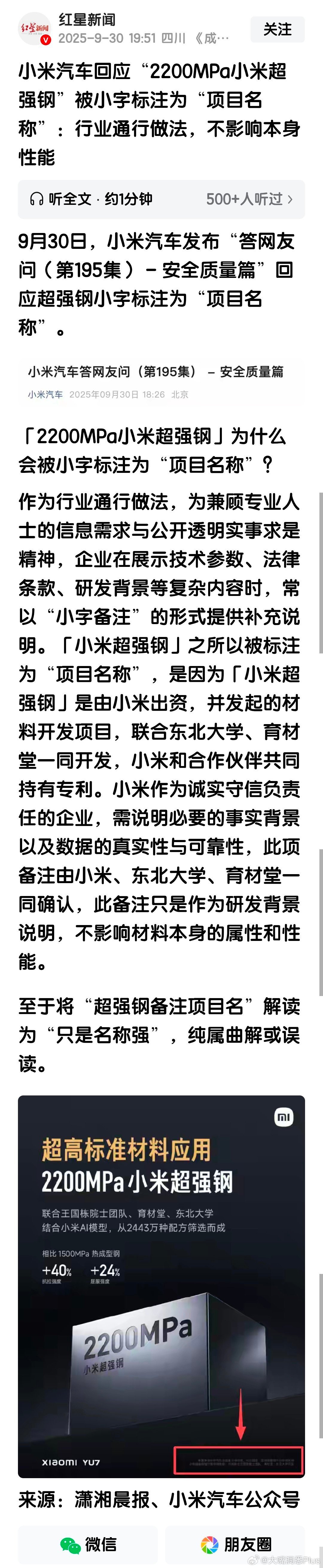 来自于红星新闻的报道:小米汽车回应“2200MPa小米超强钢”被小字标注为“项目名称”:行业通行做法,不影响本身性能