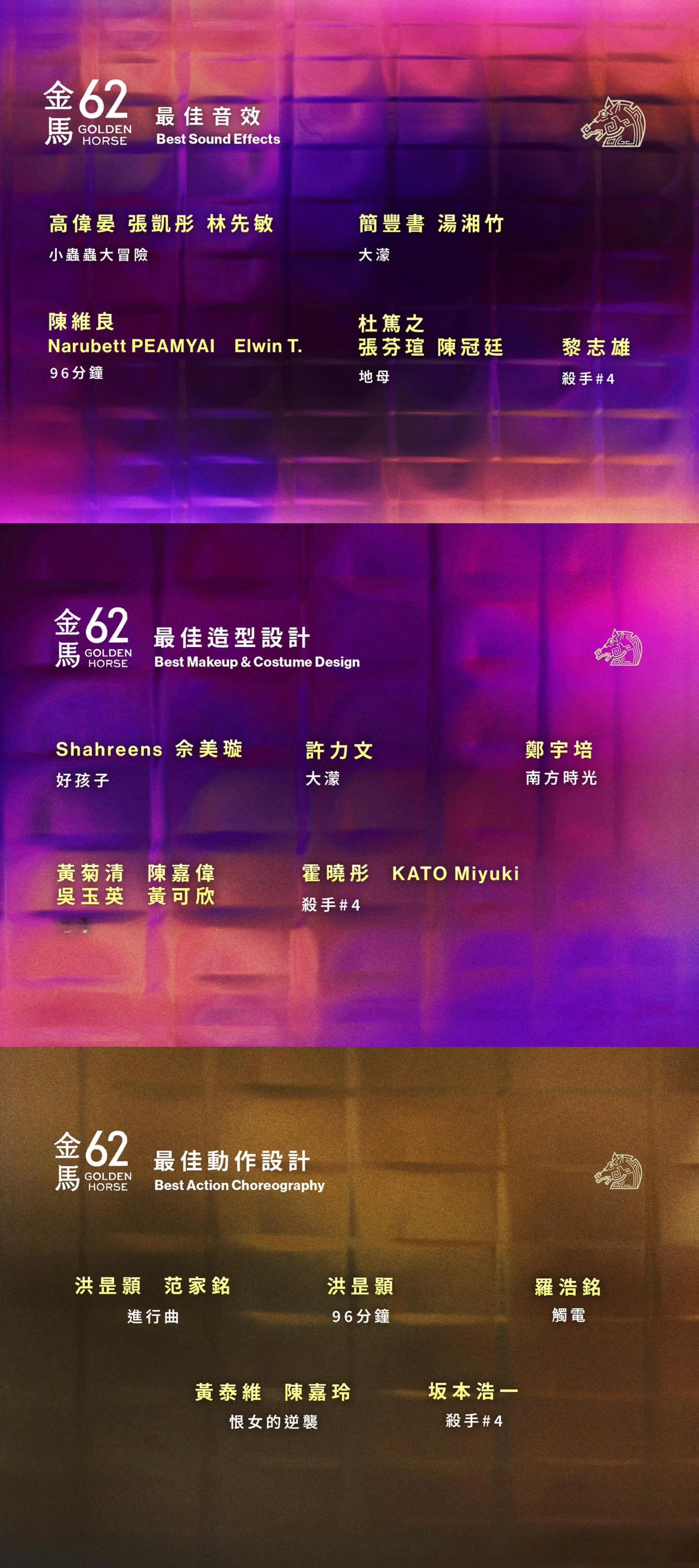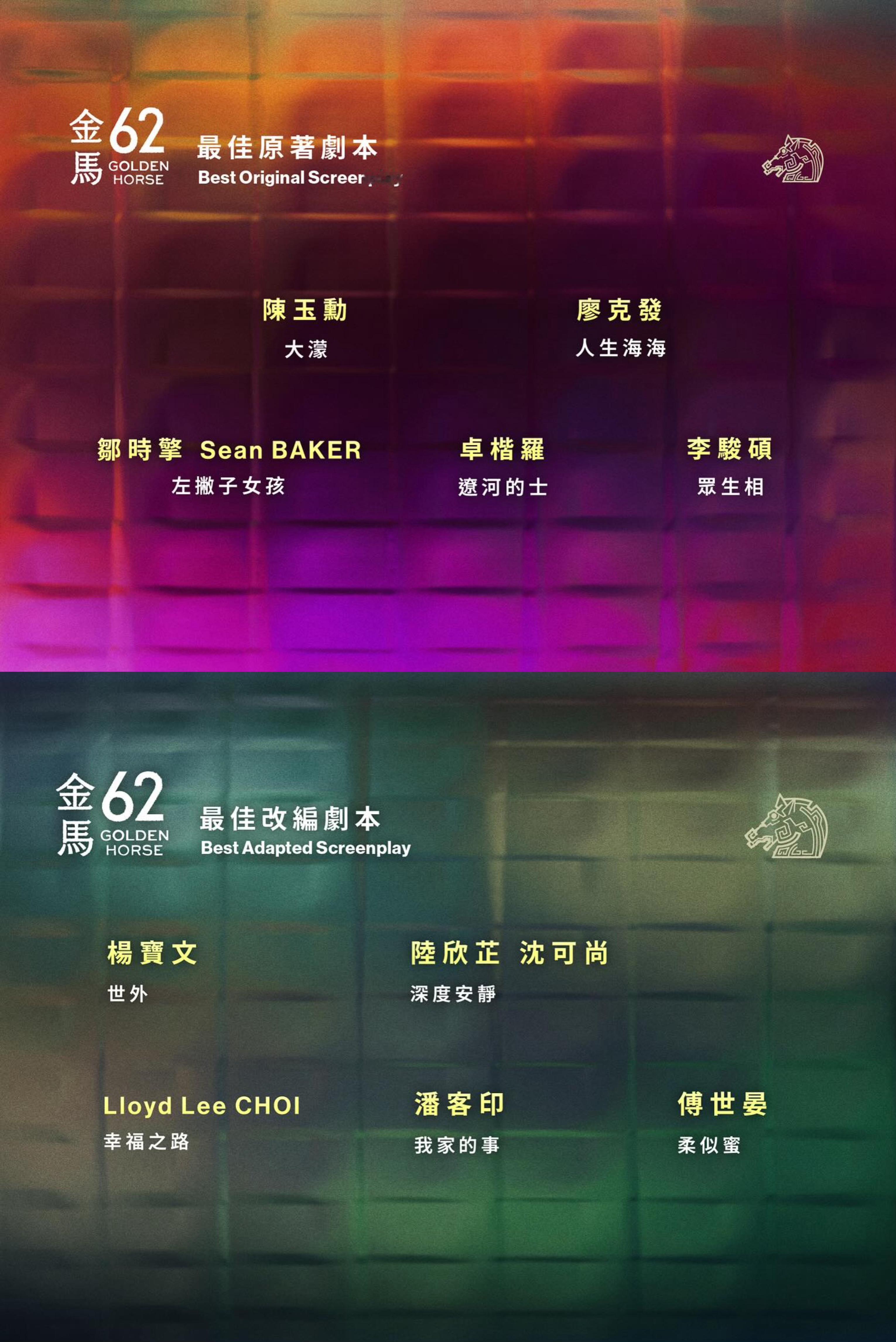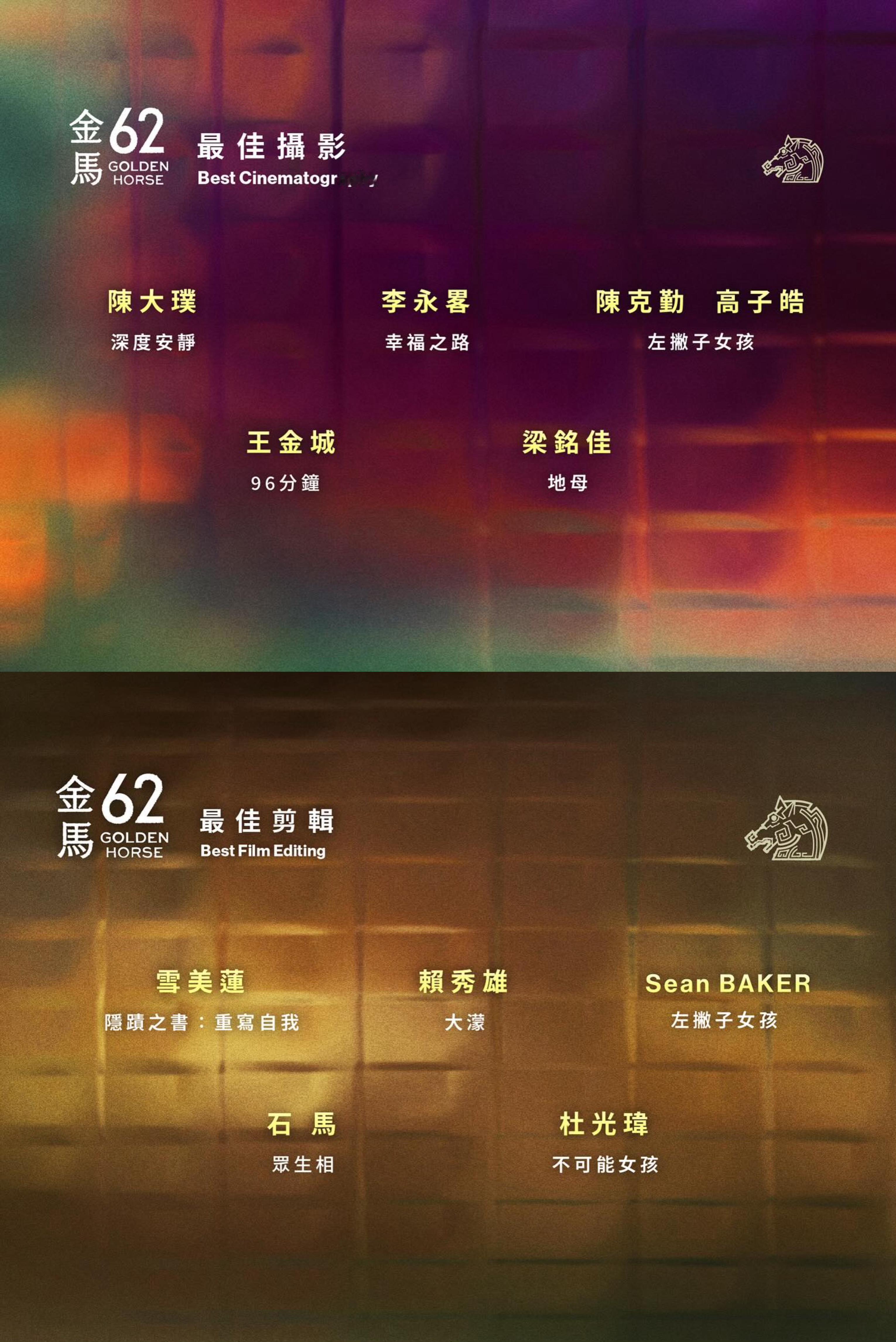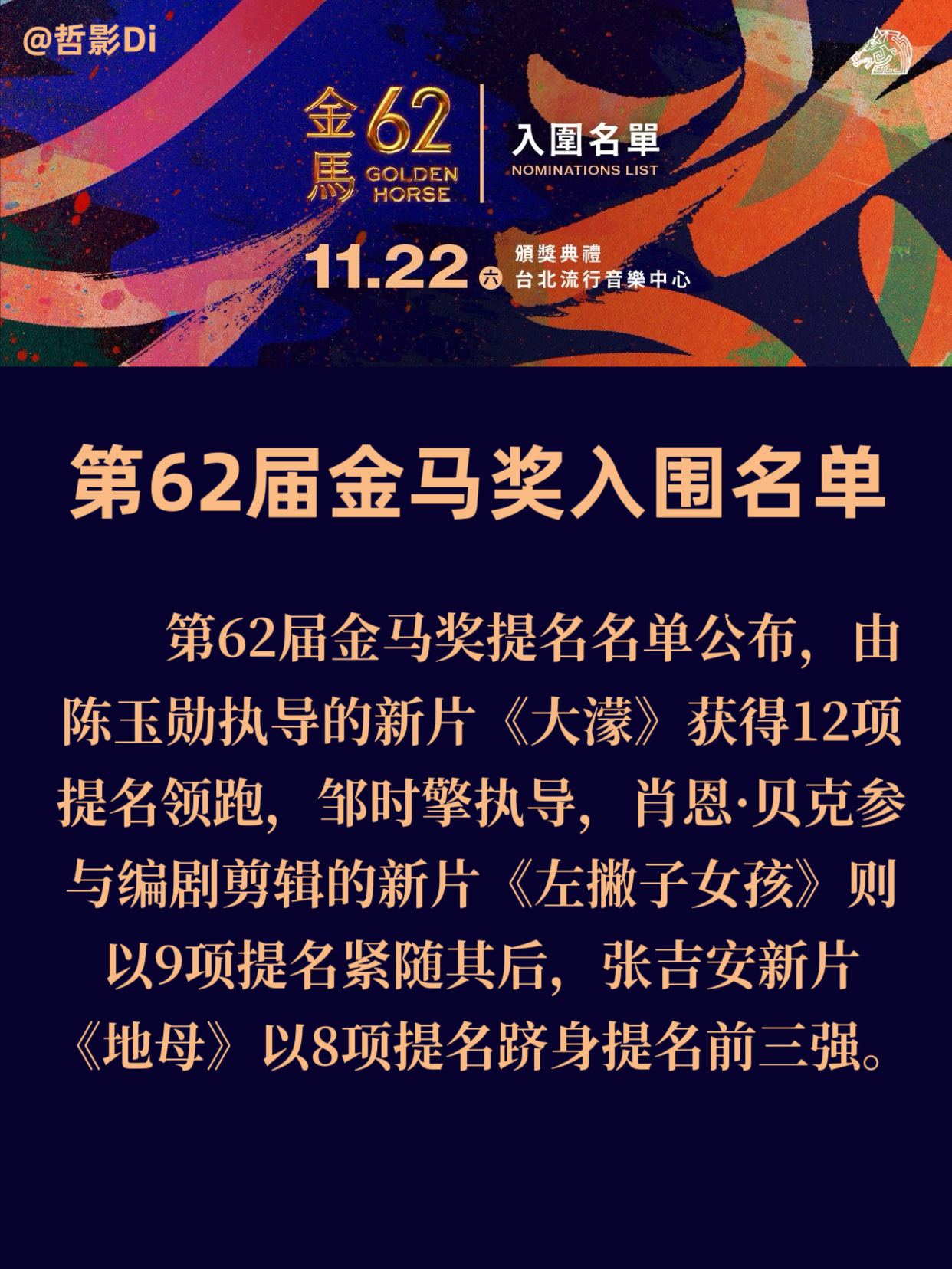 第62届金马奖提名名单公布,由陈玉勋执导的新片《大濛》获得12项提名领跑,邹时擎执导,肖恩·贝壳参与编剧剪辑的新片《左撇子女孩》则以9项提名紧随其后,张吉安新片《地母》以8项提名跻身提名前三强。