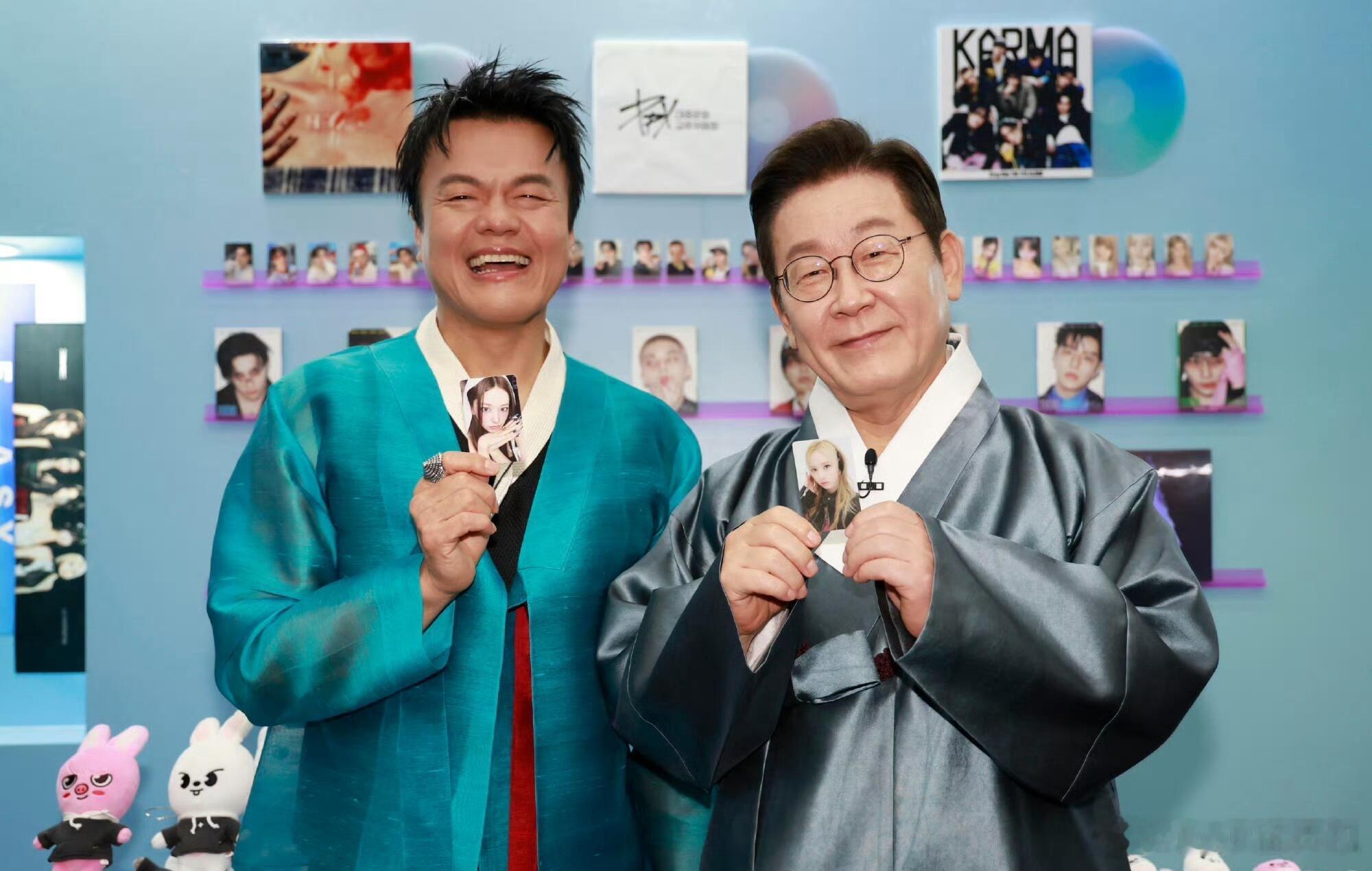 JYP和李在明合照,拿的是安宥真和金冬天的小卡