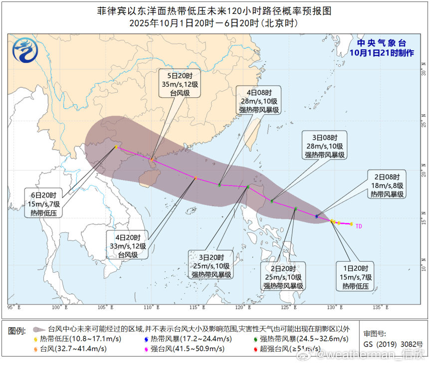台风麦德姆 今天下午-晚上,菲律宾东侧的低压继续发展中,10月2日升级编号成为21号台风麦德姆毫无悬念,10月5日登陆华南也毫无悬念,登陆区间,就在海南-广东西部一带。目前预报,较大概率是直奔湛江附近。从出现时间、路径看,类似2015年十一假期的台风彩虹,但强度弱于彩虹。