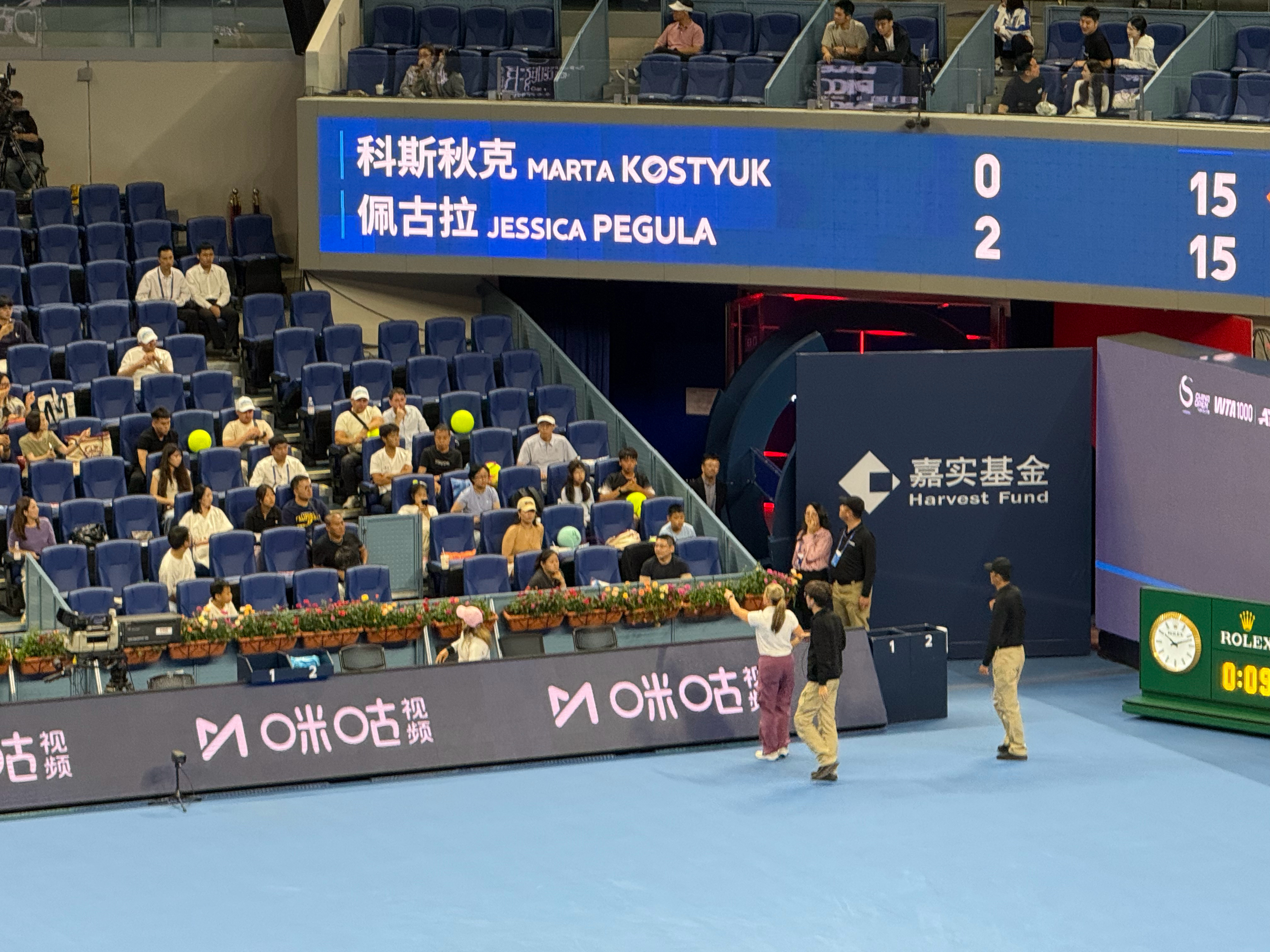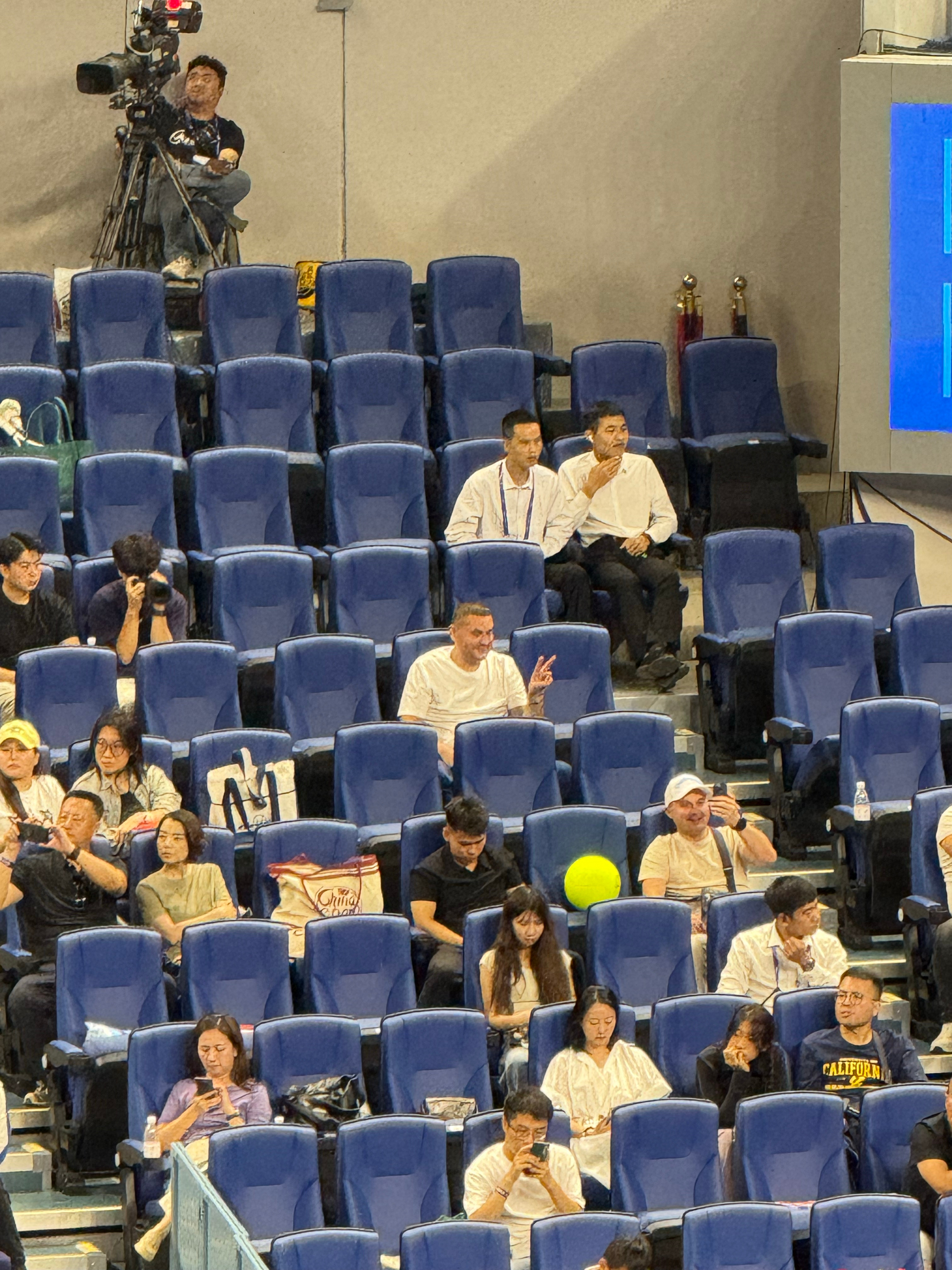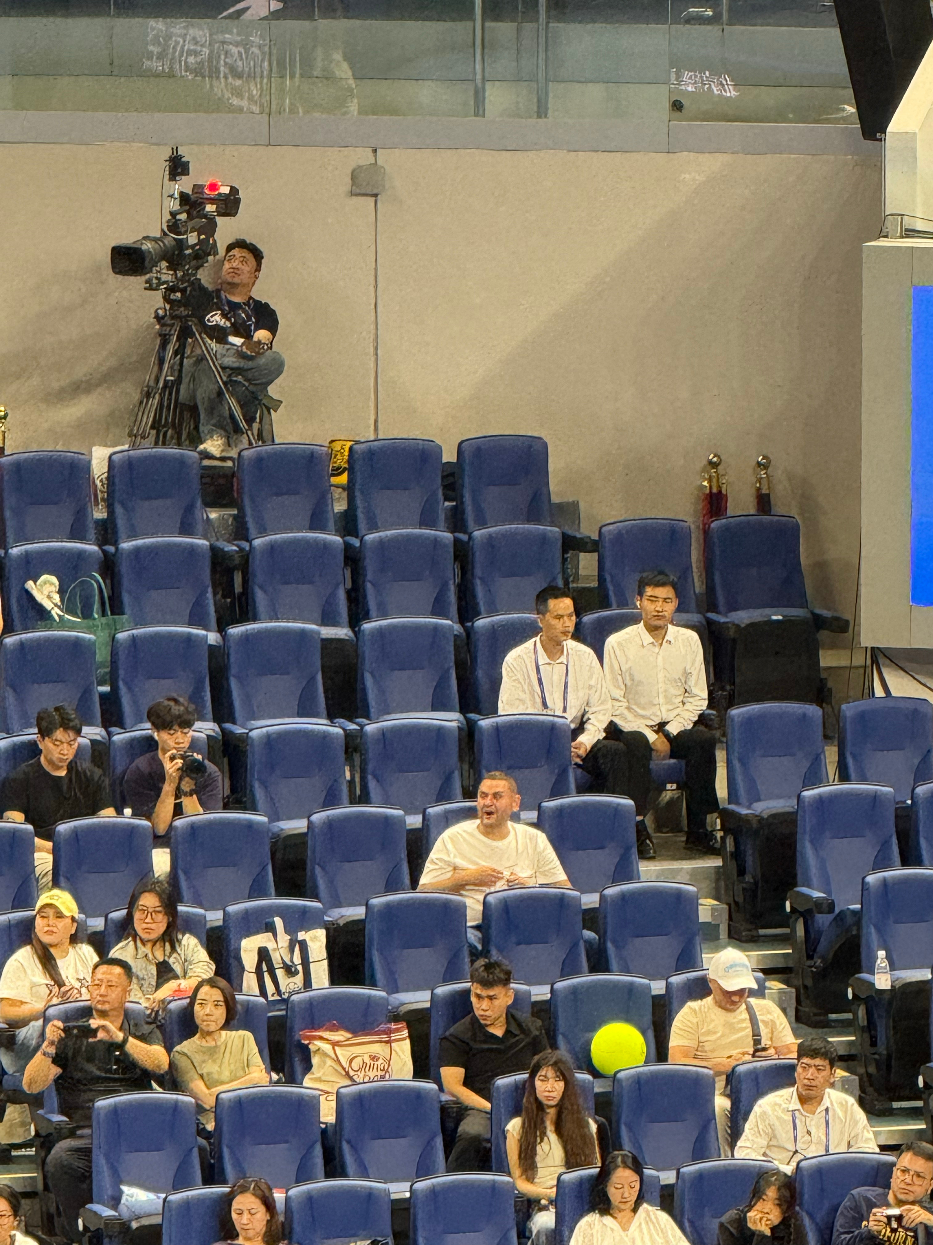 这位洋大哥是喝醉酒了吗?选手击球时也要大声喧哗,第一分就开始了。娟姐一开始中文提醒没管用,原来是听不懂人话。