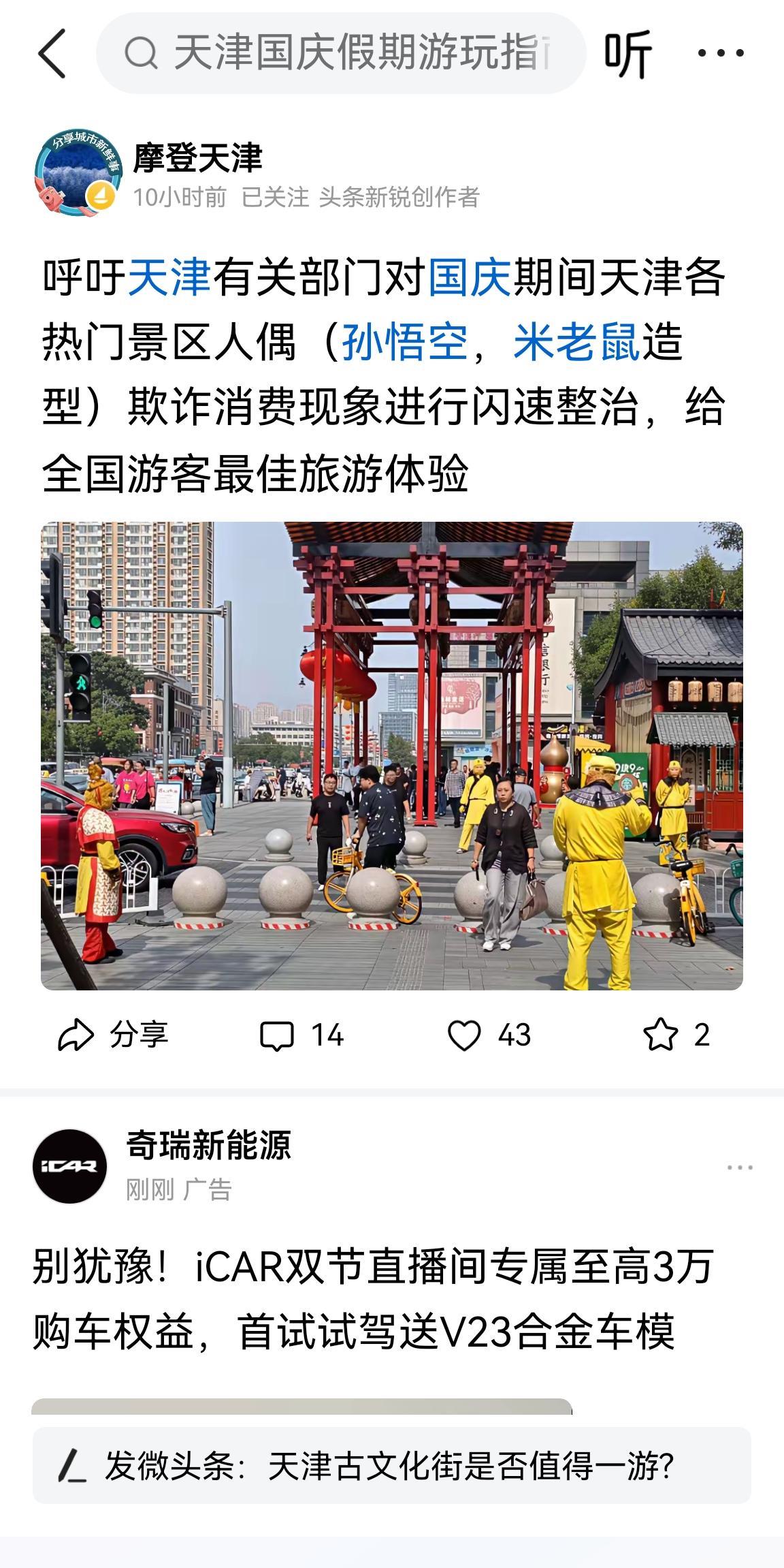 说件有意思的事。节日期间天津市整顿景区欺诈消费者现象,追得孙悟空、米老鼠到处躲藏。过街老鼠人人喊打也罢了,齐天大圣孙悟空也欺诈游客了?这肯定是假冒的美猴王。真孙悟空会筋斗云,怎么会被你们抓住?