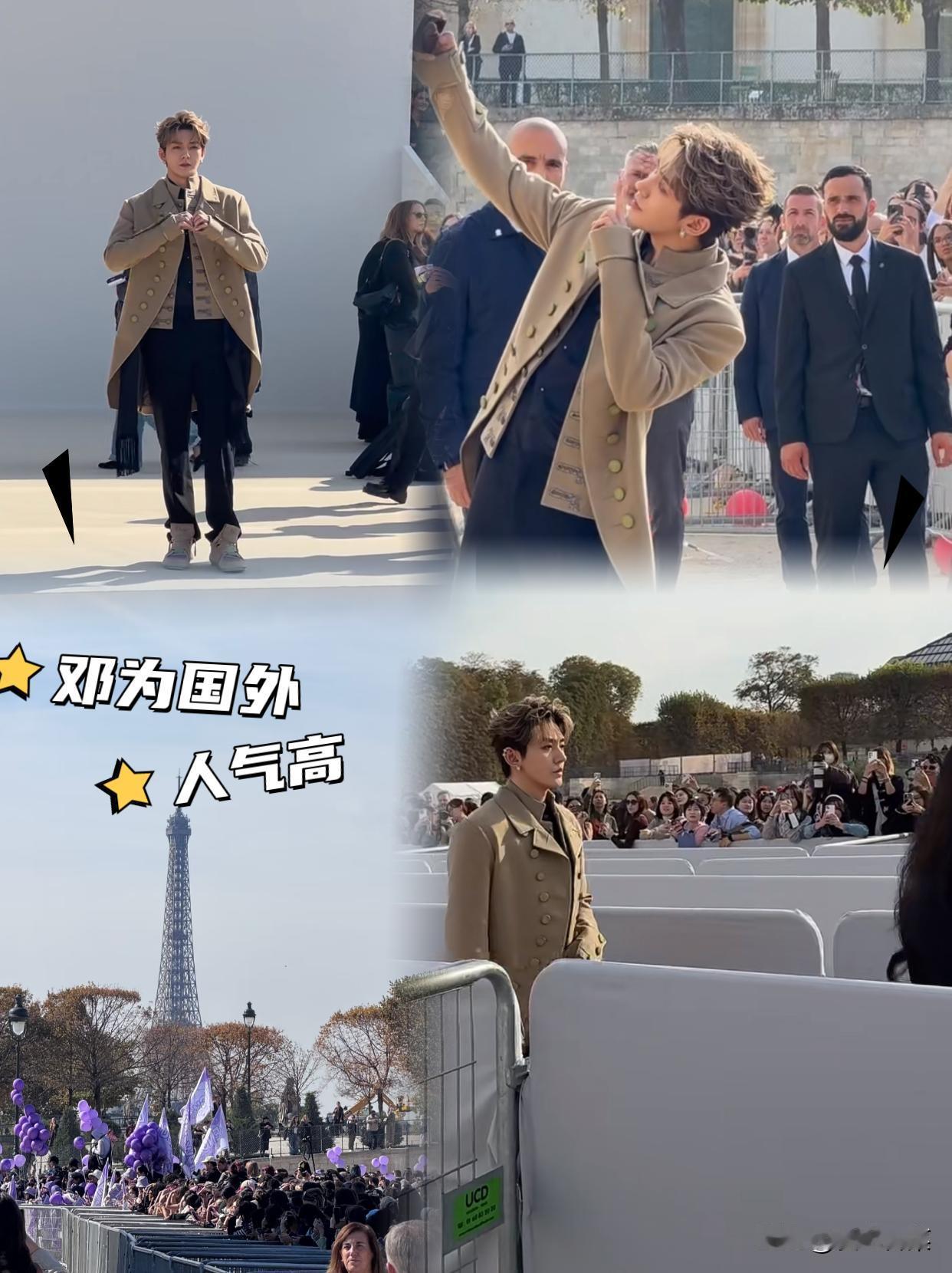 邓为国外人气真高!邓为出席迪奥大秀,没想到在国外的人气居然这么高,粉丝应援团一片紫海,本人好帅气啊!一身棕色大衣露面,与拿手机与粉丝合影,引发不少人尖叫,邓为走红的时间不长,但却在短时间内累计了这么高的人气,真是太优秀了