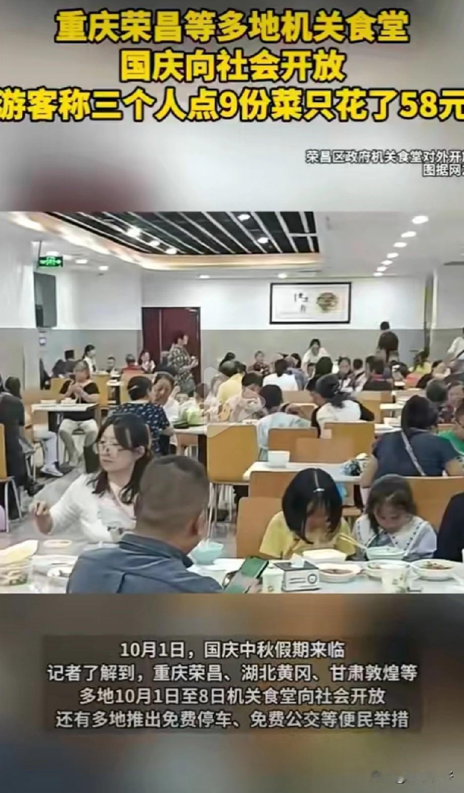 重庆荣昌区政府机关食堂在2025年国庆假期(10月1日-8日)向社会开放,提供平价餐饮服务。游客以58元点9份小碗菜(荤素搭配),3人吃饱,人均不足20元,引发热议。简直不敢相信,这么便宜。 在2025年的国庆黄金周,任何一个旅游景点的餐厅都很难找到这个价格。 仔细看了介绍以后才知道机关食堂以成本价定价,无租金和人工成本压力(工作人员为在岗职工),叠加财政补贴,菜品均为小份装,单价低廉仅假期开放,属短期惠民政策,非长期商业行为 。 挺好的,干净卫生味道好还不贵,要是有机会高低我也得去吃一顿,真的性价比很高,机关食堂吃饭真是让人羡慕。 这不是荣昌区第一次上热搜了,通过这样一个暖心举措,成功又进行了一次“城市营销”。