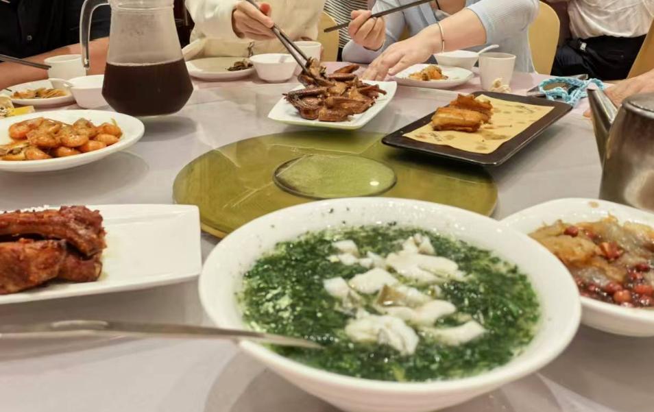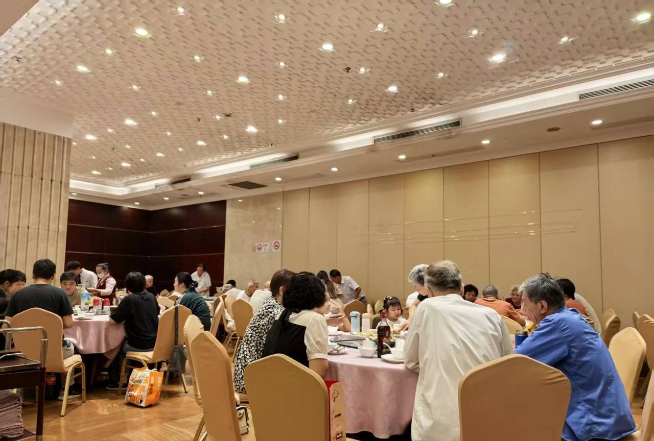 国庆第一天,10月1日,去南京东路的顺风大酒店聚餐,因为听说这里不是预制菜,而是现炒现做的菜,所以我们都跑过来品尝一下少有的烟火气菜肴。 很久没来这里,金碧辉煌的装修仍然很大气,但又感觉有点老气、过时、不太时尚了。 大堂都已经坐满,老人很多,上海人很多,菜品的选择也很多。 (1)干煎带鱼和臭豆腐虽然只有六块,但是油炸带鱼非常香和脆,老人吃的津津有味。 (2)烤乳鸽,皮脆、肉嫩、多汁。 (3)春卷、糍饭糕,都是上世纪的味道,非常好。 本帮菜很是符合我们的胃口,所有菜品都风卷残云。 这里的炒菜老少咸宜、交通方便,食材新鲜很难得了,比西贝好多了,很适合朋友聚会。下次我们还可以继续选择《顺风大酒店》。 中午顺风大酒店,华为店,上海新世界大丸百货,外滩,上海书城,振鼎鸡 #顺风大酒店##西贝#