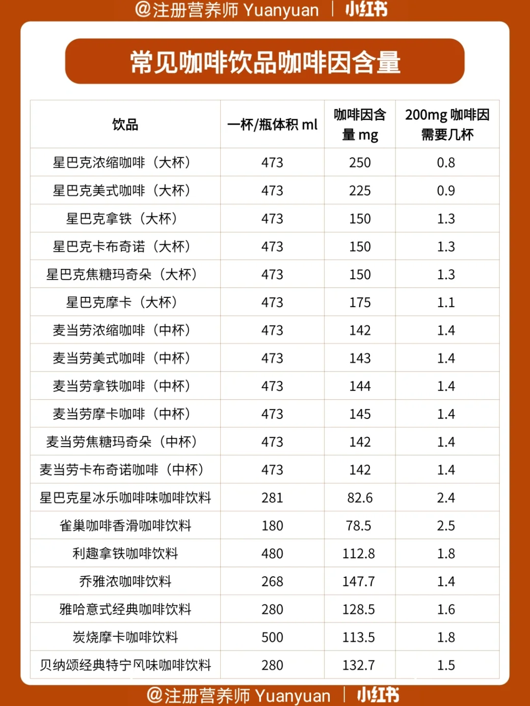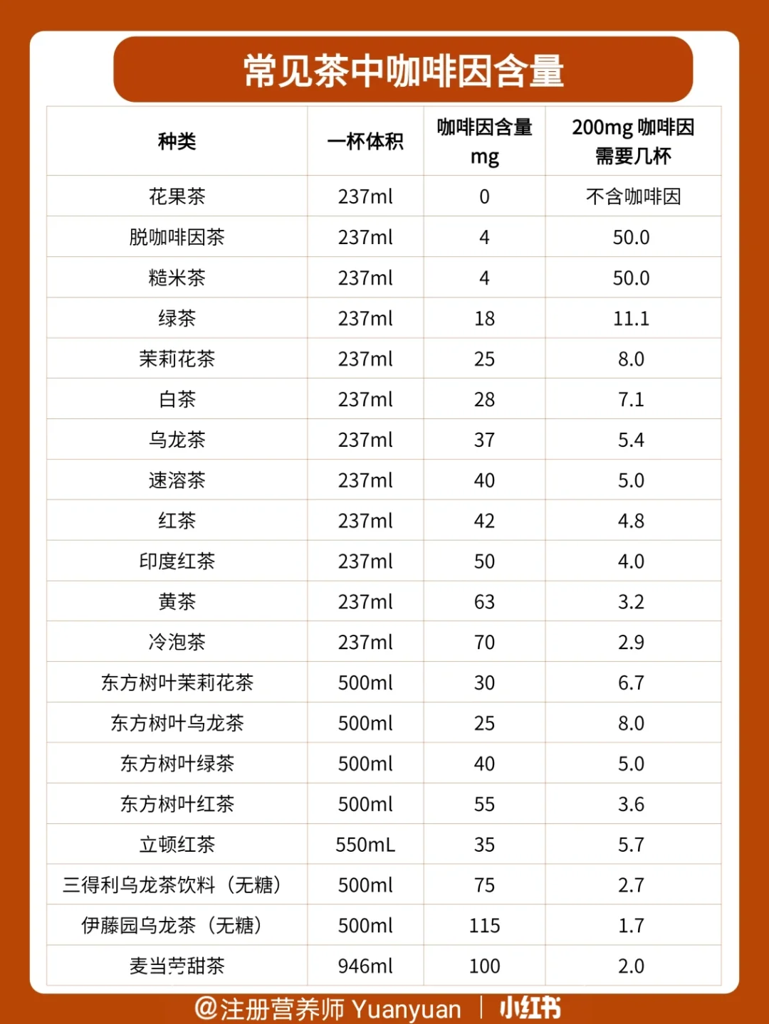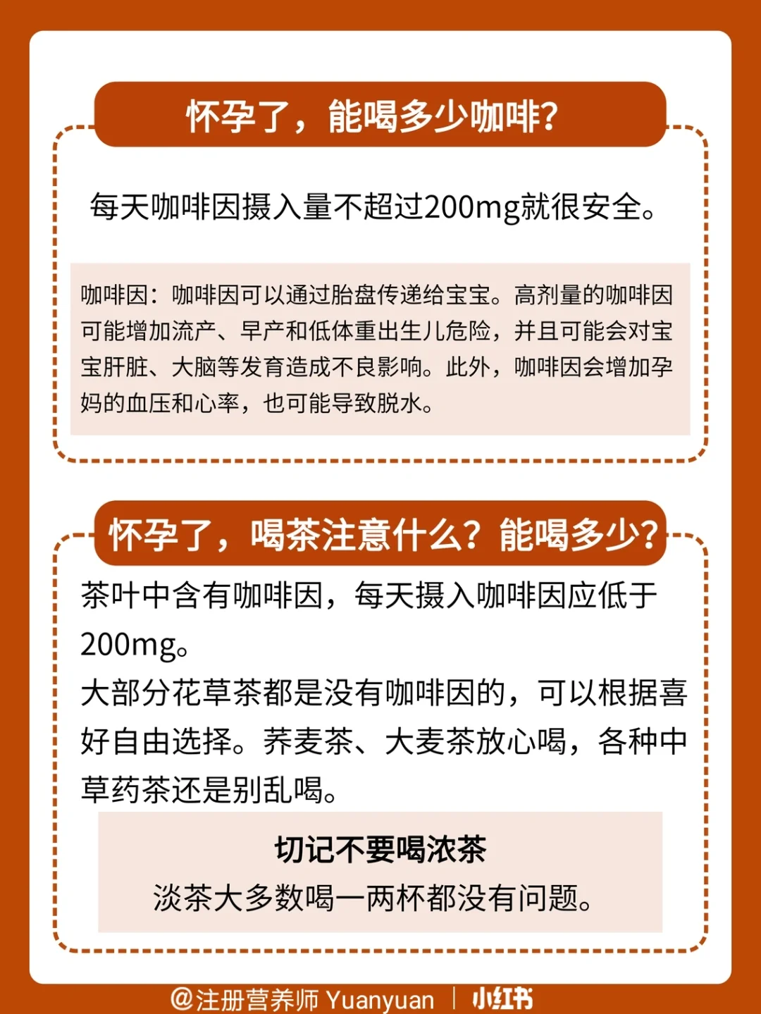 ⭐️咖啡和茶能不能喝,喝多少,主要看里面咖啡因含量,每天咖啡因摄入量不超过200mg就很安全。