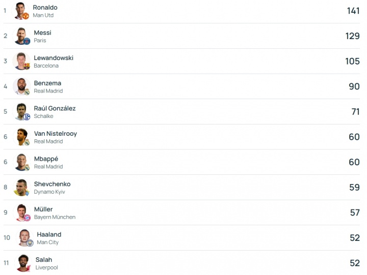 此役过后,哈兰德在欧冠赛场50场比赛打进52球,超越51球的亨利,挤进欧冠历史射手榜前十,与萨拉赫并列第10位。