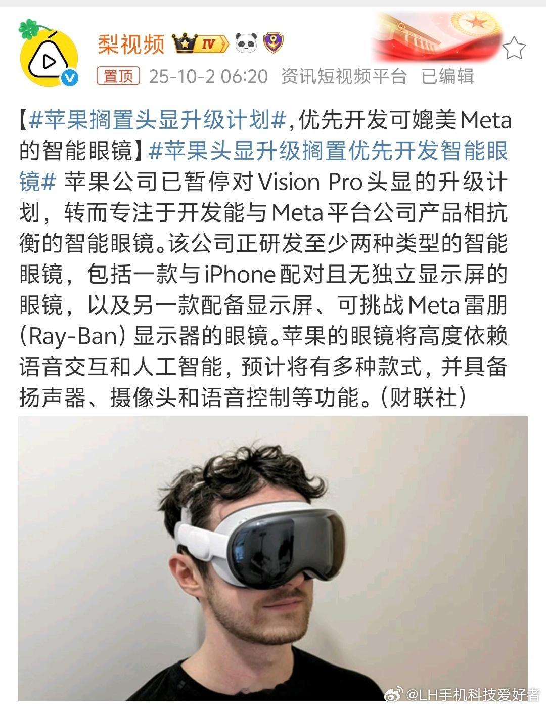 苹果搁置头显升级计划网传苹果公司搁置头显设备的升级计划,看来第一代Vision Pro头显市场反响一般吧。接下来,苹果要开发智能眼镜,至少两种类型,不知道能不能成功。