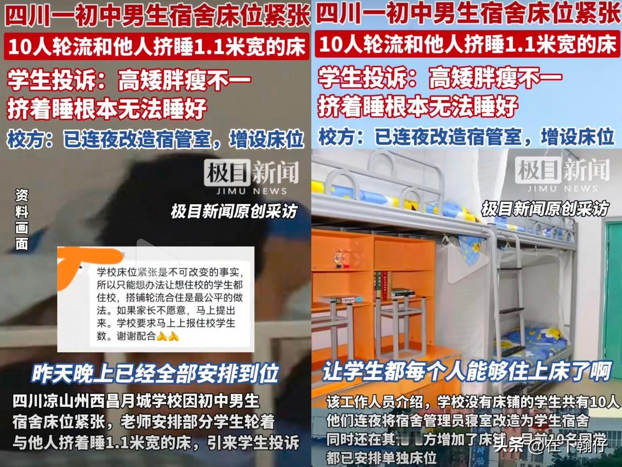 西昌一中学“九人八床”闹剧: 挤出来的床位与“消失”的重点班 近日四川凉山州西昌月城学校的初一男生宿舍,上演了一出令人匪夷所思的“床位轮换”戏码。由于2025年秋季招生超额,学校宿舍床位紧张,部分8人间竟被安排入住9名学生,轮流搭铺合住。与此同时,有家长投诉该校违规设立“重点班”,称1-5班每班约55人,而普通班则高达70人,涉嫌教育资源分配不公。 在舆论发酵后,校方的反应堪称“光速”。9月29日连夜改造宿管室、功能房等闲置空间,9月30日就宣布所有学生实现了“一人一铺”。西昌市教体局紧随其后,在10月1日发布通报确认问题解决,并干脆利落地否认了存在“重点班”。 学校床本就狭小,让两个半大孩子长期挤一张床,何谈休息质量与个人隐私?这种“轮流睡”的方案,与其说是解决,不如说是应付。哪位“人才”想出来的下策?正如网友所言,哪怕是临时找几张行军床凑合,也比这强。遇到问题主动作为、未雨绸缪,不能等到问题被曝光后,才着急忙慌的“打补丁”。