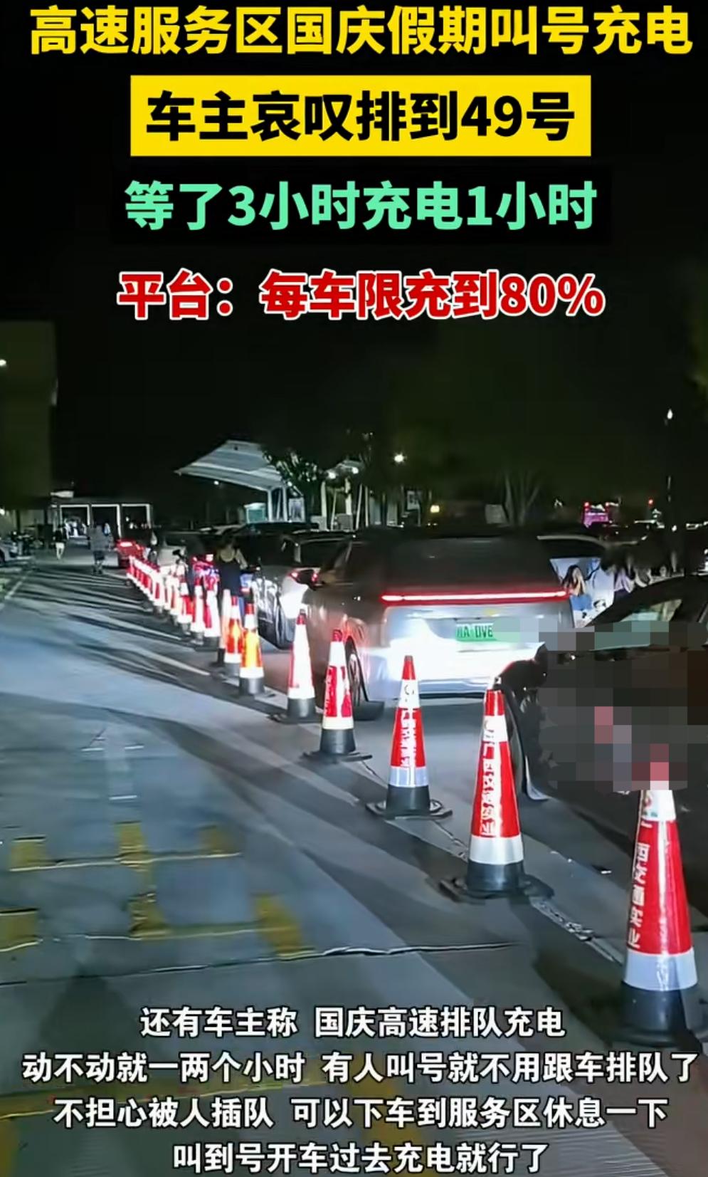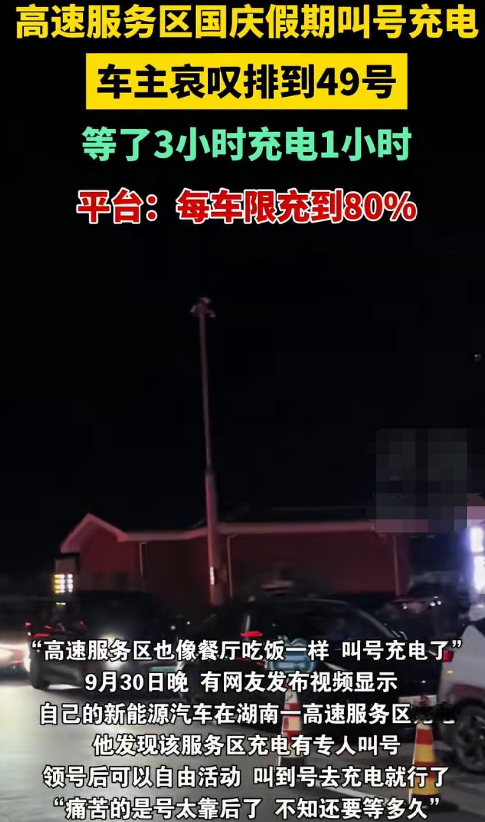 悲哀!电车高速充电都要排队拿号了! 逢年过节,高速免费出行高峰,电车的短板开始显现,堵车堵的有电车半路就没电了,有的进到到服务区排队3小时没充上电。 网友发视频吐槽湖南永州高速充电桩从9月30号开始,就实行了叫号充电,并且最多只能让充到80%的电,她拿到了49号,排了3小时队,前面还有14个人。 于是有网友开始幸灾乐祸: 有的说:电车确实省油,没毛病,油电混动的车就不要去排队了。 有的说:油车也好不到哪去,平时加油4分钟就可了,国庆竟然用了8分钟。 还有的说:非得扎堆去挤充电桩,可以下高速去充电,然后再上高速,反正高速这期间是免费。 就事论事,没跑过湖南高速的是不知道,本来就两条道,堵车的时候一旦下了高速,很多就挤不上去了,因为太堵,不少高速口是封着不让上。 去年过年开车经过湖南,高速堵6小时一动不动,拐下去了,国道也是排长龙,想上高速根本没地上,只能跟着大车流往前挪,一天一夜没出湖南。高速充电桩少,只是客观因素,主要还是湖南高速那地太堵了。 不吹不黑,电车就算是再多,也是淘汰不了油车的,电车只适合短途,长途还得是看油车,至于增程,不多说,懂得都懂,有的时候,时间也是“钱”! 国庆高速充电桩叫号:等3小时充1小时 充电排队