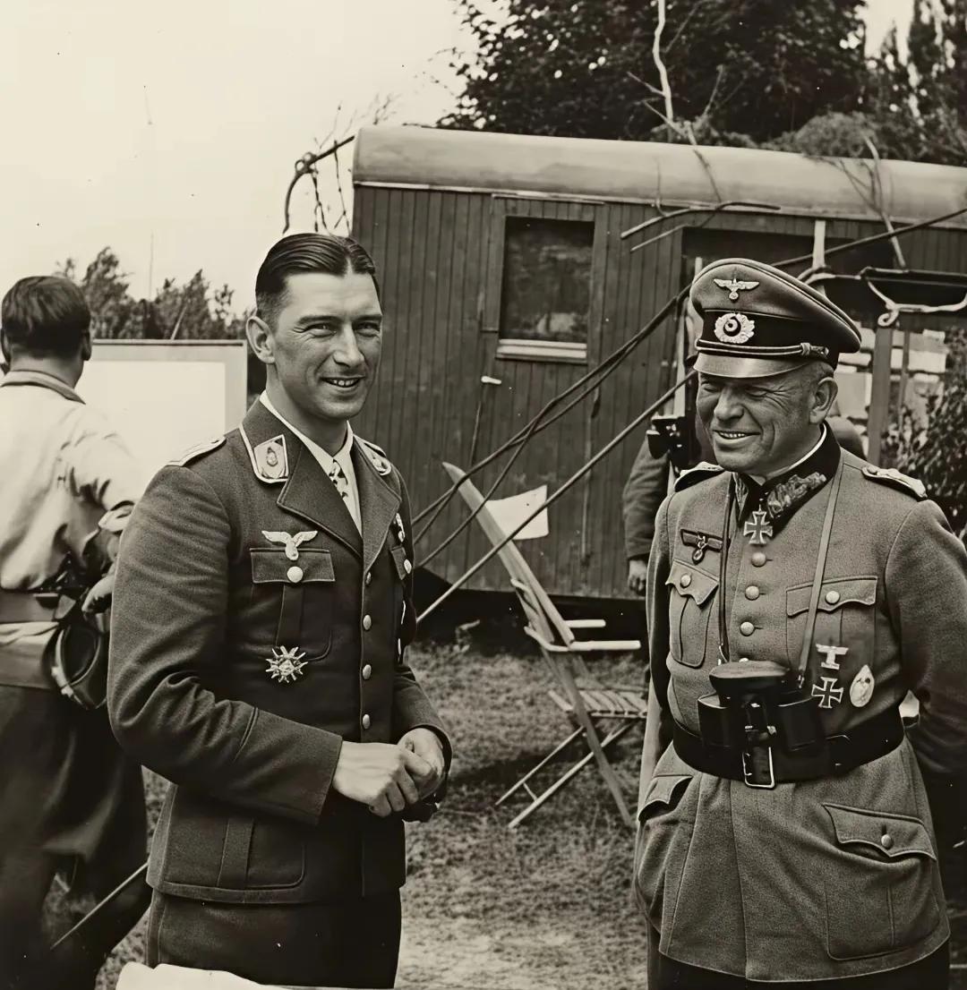 这是二战时期两名德军军官在闲聊。左边这位是大名鼎鼎的德军王牌飞行员,飞行技术十分精湛,在历次战斗中战功卓著。咱也没见识过他那高超技艺,不过从图片里看,他梳着整齐的分头,显得帅气又精神。 旁边那位军官,看样子官衔也不低,领花上全是烫金标志。有懂行的人能看出这是什么军衔吗?瞧着像是个大官。 当时他们可是相当显赫的人物,不过二战结束后,估计都成阶下囚了吧。