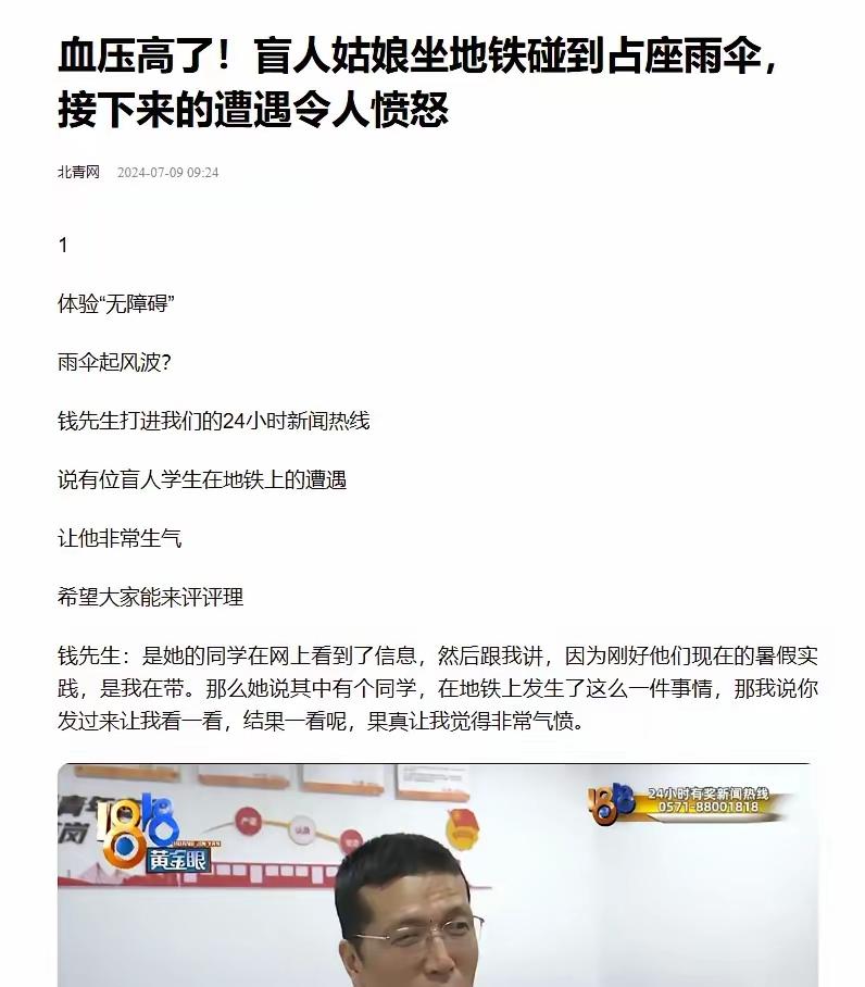 浙江杭州,一盲人女孩独自坐地铁,因不小心碰到旁边女乘客的雨伞,被女乘客指着鼻子骂了一路:“赔伞!没事找事来这瞎编!”盲人女孩的老师知道后,表示这位女子必须给孩子道歉!目前警察已立案。 信息来源:1818黄金眼 网友评论: 这女的公司不能用立马开除,判刑一年,要好好教育,以后公司都不能录取这女人,坏女人。 这个女子不觉得丢人吗?看到盲人不该主动收了,让座吗?还骂列车员,你以为骂了别人,显现出自己的高贵吗?没发现是自己贬低了自己! 可能有洁癖,看她戴的手套和屁股底下垫着纸,既然这样尽量不要坐公共交通工具,省得自己难受,而且就算洁癖,对待特殊群体也应该有所宽容 做人不要求你做到乐于助人,但也不能道德败坏,这种人以后没有好下场,连一个盲人都欺负。