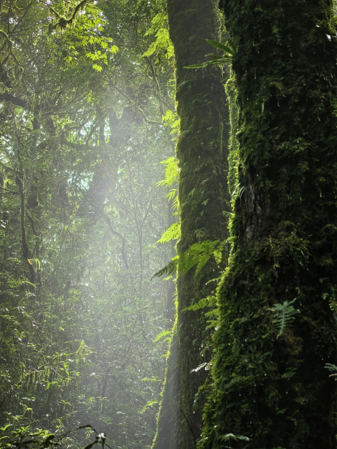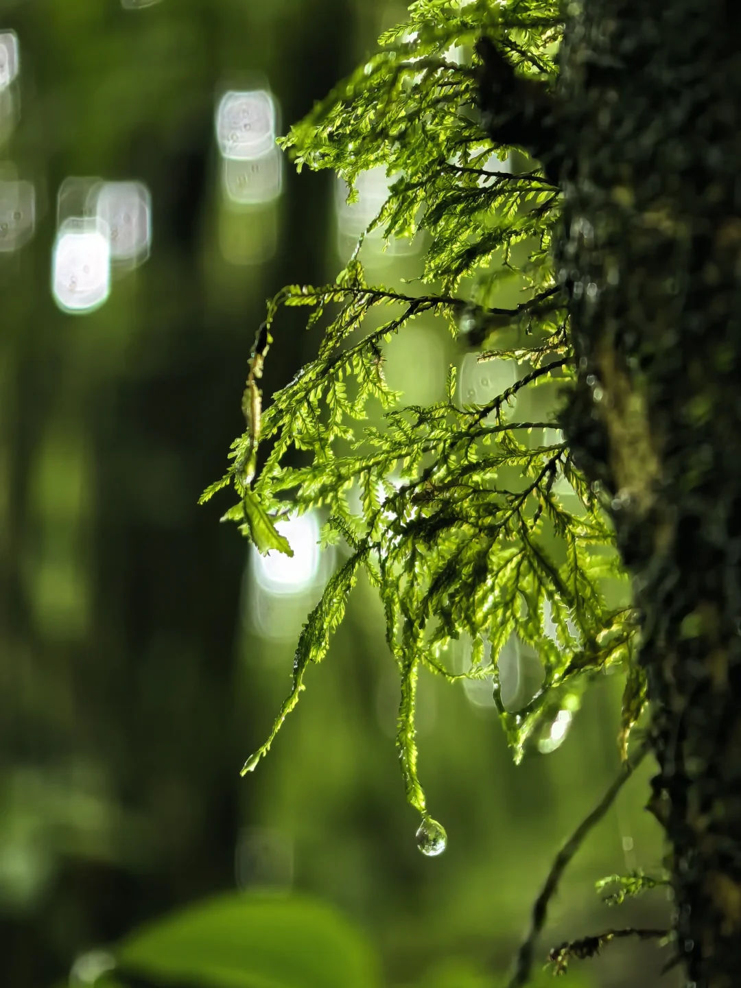 雨停得比来时更急,雾也随之散去,森林像换了副模样:树叶上的水珠折射着阳光,苔藓绿得发亮,溪涧水量暴涨,叮咚声在山谷里回荡,紧张早已被惊叹取代