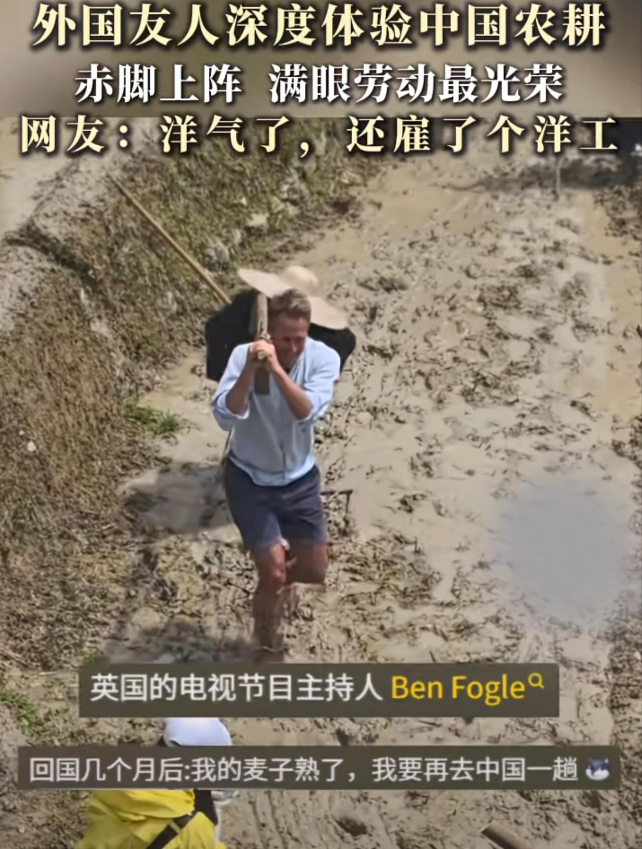 赤脚上阵,满眼劳动最光荣!外国游客在中国开启深度游,体验在广西的农田里干农活。网友:洋气了,还雇了个洋工。外国人在中国 农活体验