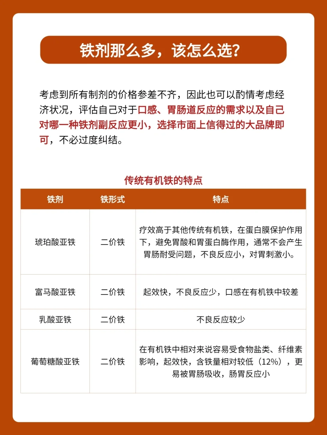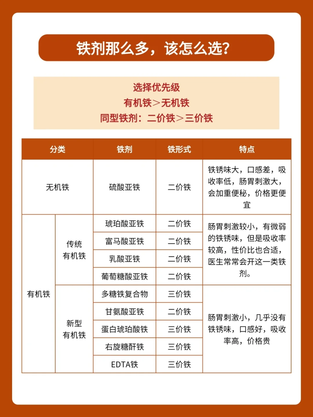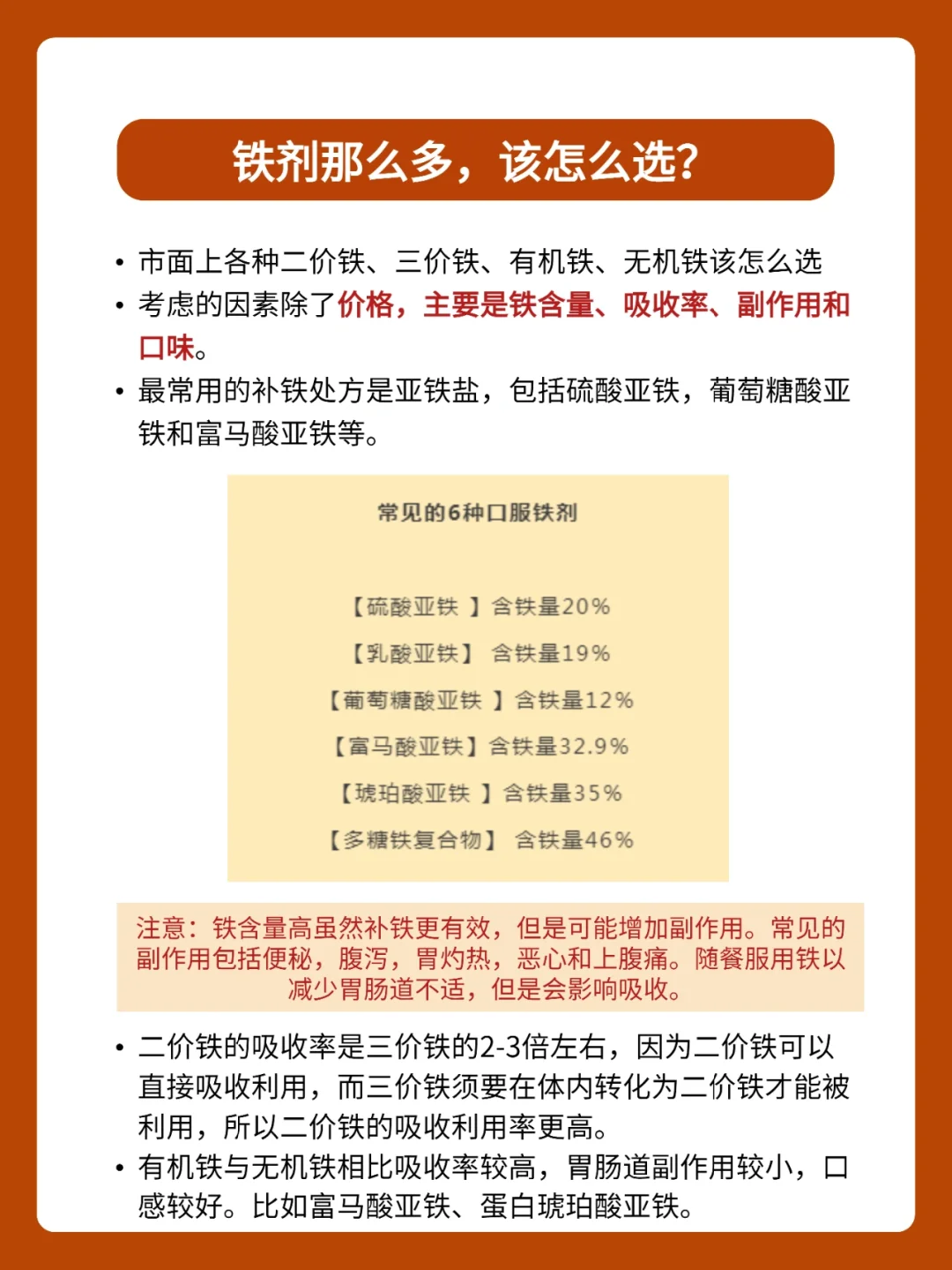 市面上各种二价铁、三价铁、有机铁、无机铁该怎么选?考虑的因素除了价格,主要是铁含量、吸收率、副作用和口味。