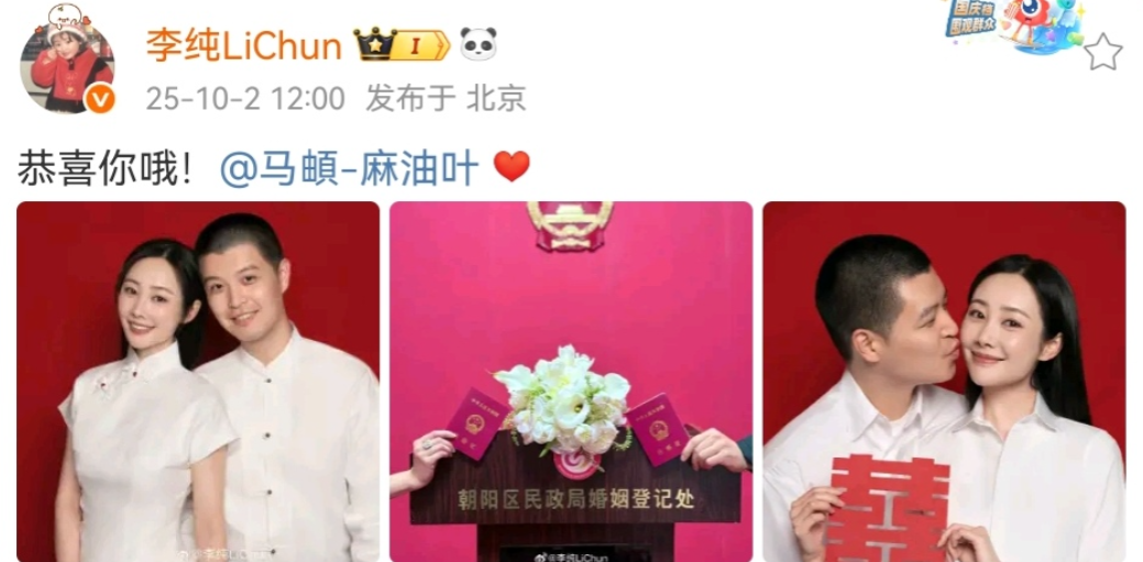 李纯结婚了,老公是马頔,他们俩在10月2日中午12点,同一时间在个人账号官宣结婚,时间相同,配文也一模一样:恭喜你哦。呵,有点意思……