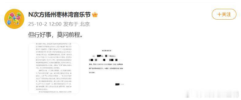 扬州枣林湾音乐节发文:原定参演本次枣林湾音乐节的一位青年表演嘉宾,其经纪团队在阵容官宣前夕临时追加合作条件,在早已确立合作费用的前提下“坐地起价”,导致该嘉宾无法如期官宣。