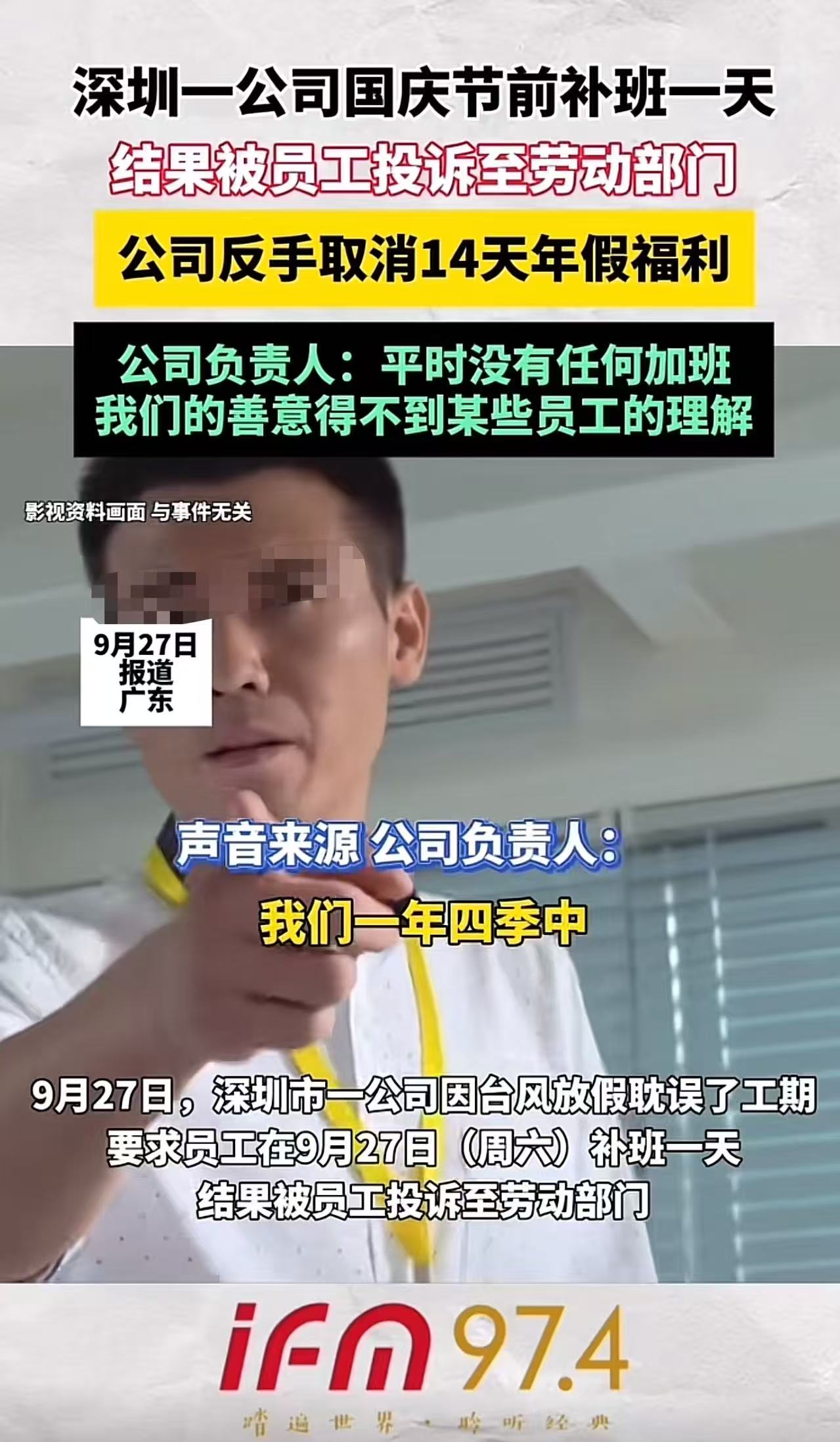 吵翻了!深圳一公司因台风放假一天,之后因国庆假期临近,为确保货物及时发出,要求员工9月27日补班一天,结果被员工投诉至劳动部门!公司反手取消14天年假福利!有网友说,这次我支持公司!人就是不能太惯了!也有人说公司玩不起!