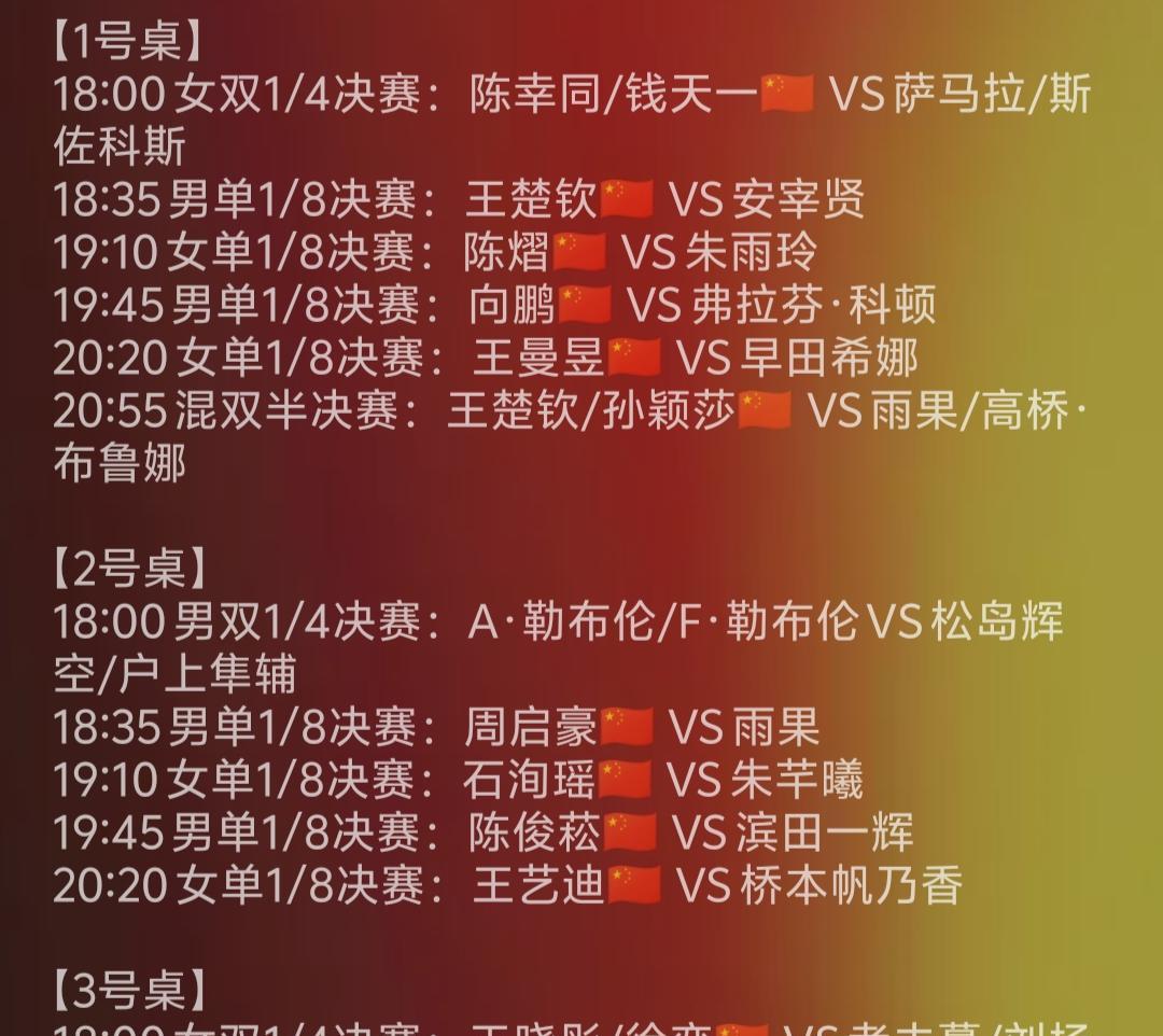 20:20女单1/8决赛: 王艺迪VS 桥本帆乃香, 这场比赛,是今天(10月2日)格外关注的比赛, 其一,看第三次相遇的王艺迪,能不能胜得了桥本帆乃香。 其二,目前,国乒里只有孙颖莎、王曼昱胜过桥本帆乃香,陈幸同和蒯曼没有与桥本帆乃香交过手。 其三,桥本帆乃香胜过王艺迪、钱天一、覃予萱、王晓彤、何卓佳等。 其四,众多球迷希望王艺迪能够翻盘,力克桥本帆乃香。 另外,一场比赛也同样值得关注, 20:55混双半决赛:王楚钦/孙颖莎VS雨果/高桥·布鲁娜, 王楚钦/孙颖莎面对雨果与布鲁娜这对情侣, 也是要打起精神, 要想办法抑制住对方的速度和快衔接。
