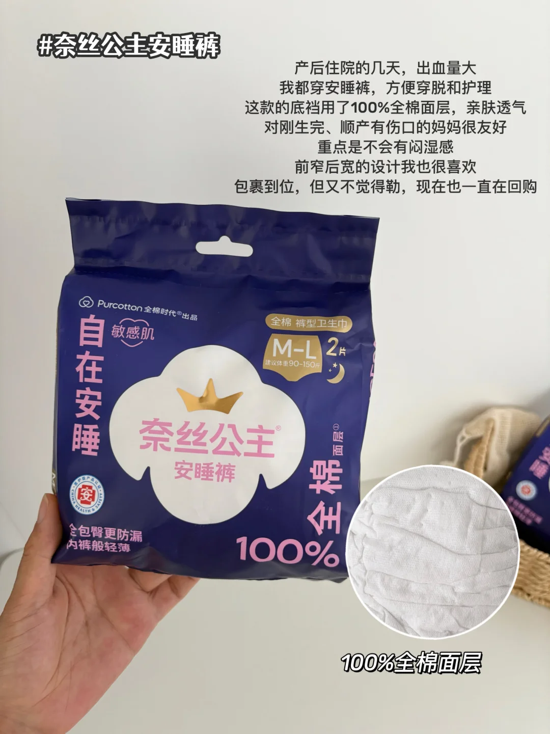 我用的是奈丝公主安睡裤,它的底裆是100%全棉面层,对刚生完、尤其是顺产有伤口的妈妈特别友好