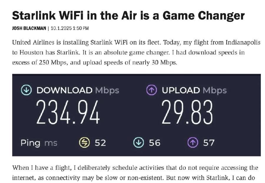 世界最大航空公司美联航已经向马斯克购买了星链服务,一位旅客分享了在航班上使用星链