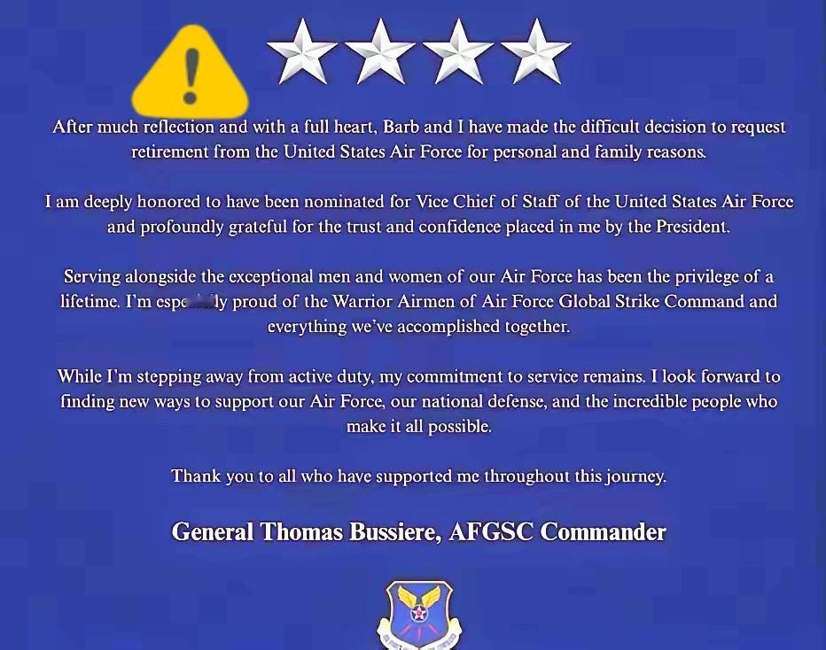 不跟你们玩了? 美国四星上将突然退役?这位置可不是想走就能走的 美军核威慑“掌门人”突然撂挑子了!掌管空军全球打击司令部的四星上将Thomas A. Bussiere,10月1日直接在社交媒体官宣退役,这操作着实让人意外。 要知道他坐的可是美军战略核心位置,管着洲际导弹和远程轰炸机,是对华对俄核作战的关键角色。这职位当年特意从中将级升为上将级,就是为了强化全球威慑力[__LINK_ICON],哪能说退就退? 结合最近美军内部的“召回风暴”和将领间的争议言论,这退役恐怕不简单。大概率不是真“想休息”,更可能是内部调整的信号,毕竟这种级别的将领动向从来和“个人意愿”没太大关系。 美军这波高层变动到底藏着什么门道?是战略转向还是内部洗牌?你们觉得这退役背后还有哪些隐情?