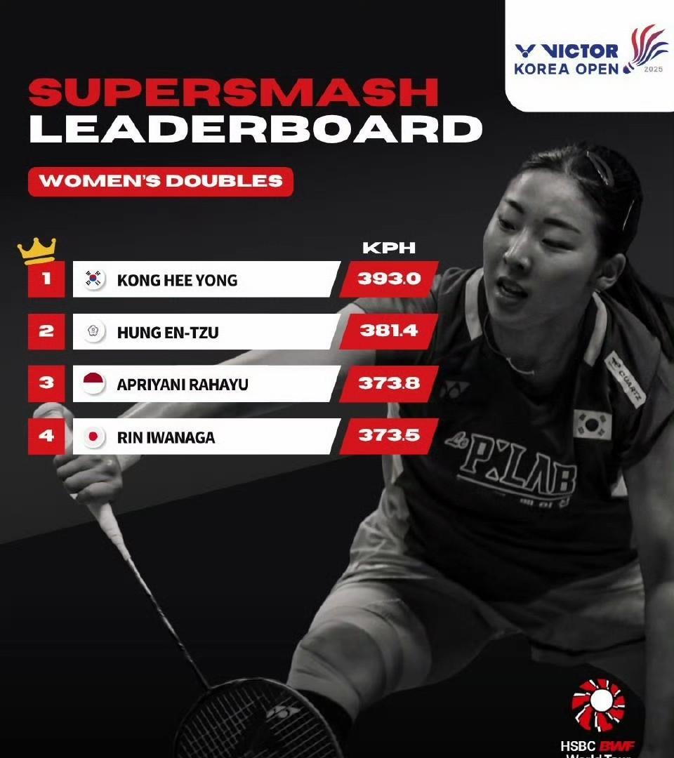 #2025年韩国羽毛球公开赛#各单项杀球时速排行榜 反而这次的冠军都有上榜的了[
