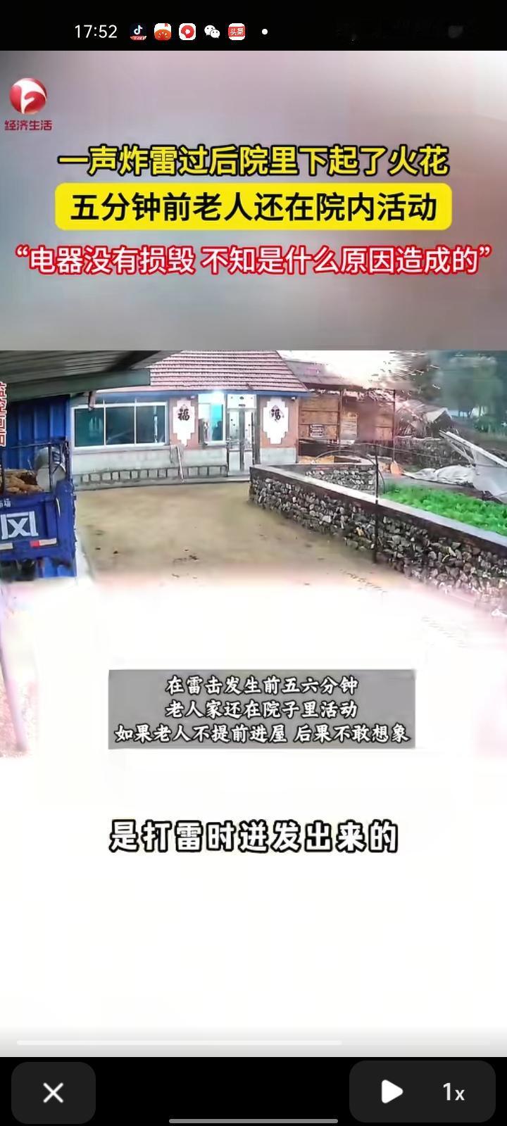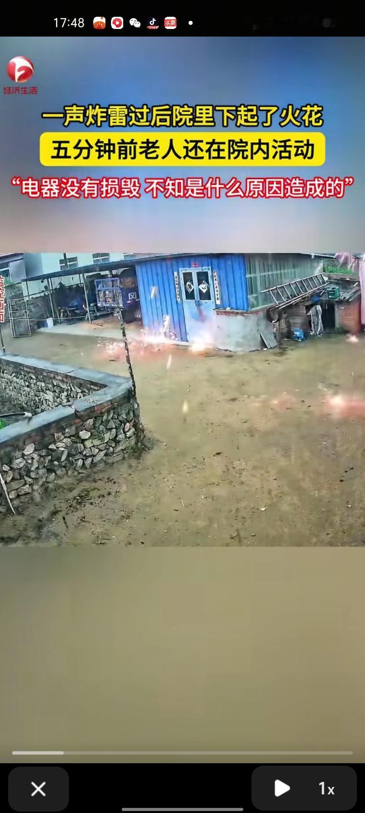 9月30日,辽宁鞍山。一声炸雷后院子下起了火花,五分钟前老人孩还在院内活动。蒋女士称,监控中的一幕发生在自己老家,当时父亲一个人在家。在雷击发生前的五六分钟,父亲还在院子里活动,如果不提前进屋,后果不敢想象。之后了解到,家里除了网线受到损毁外,没有其他财物损失