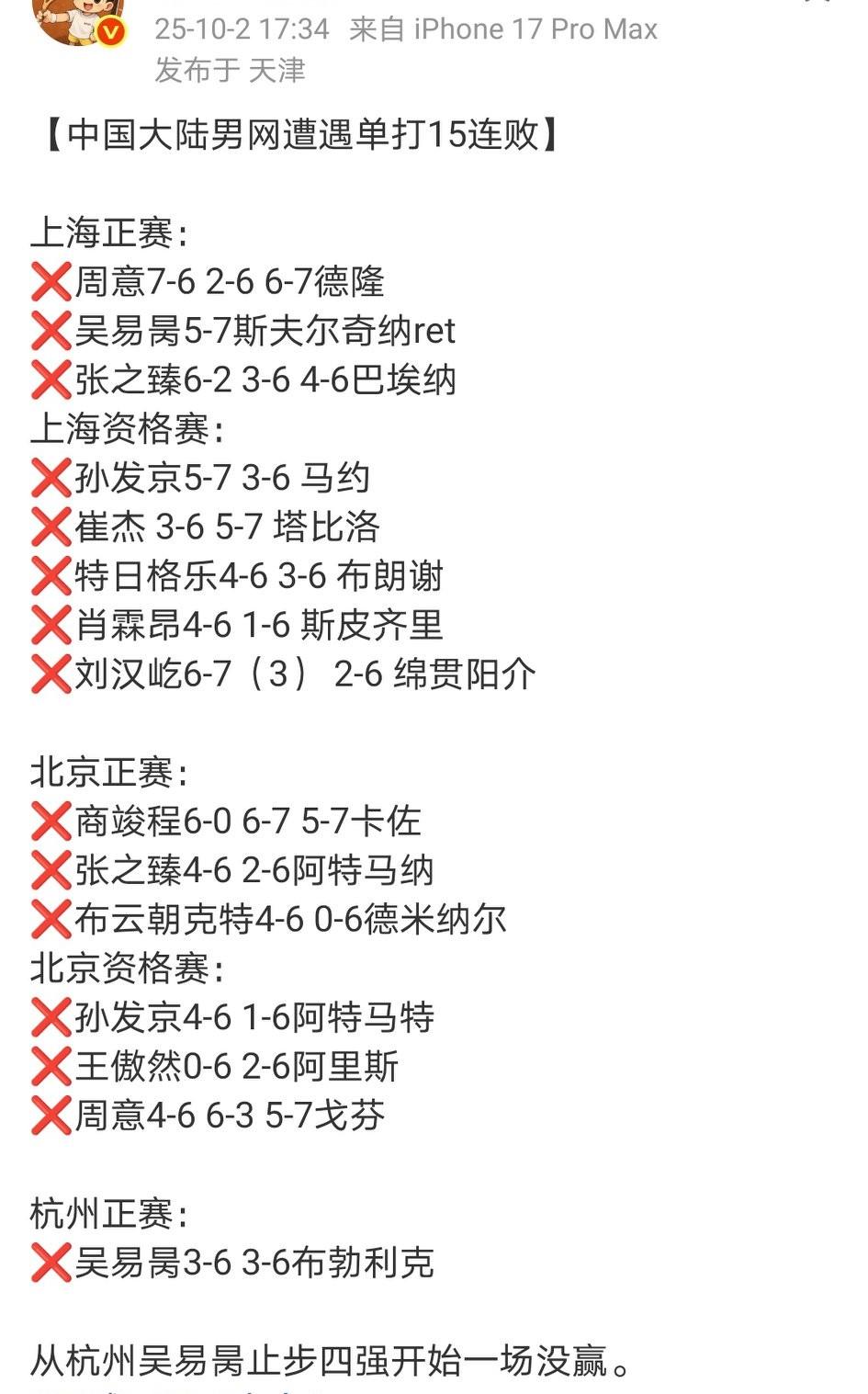 又一位中国球员止步首轮!上海大师赛首轮,周意鏖战三盘以7-6(1)/2-6/6-7(3)憾负荷兰选手德容,无缘晋级。 此役周意表现顽强,首盘曾在2-5落后之下奋起直追,通过抢七先拔头筹。然而决胜盘战至抢七,他未能延续气势还是输了。 5个已经折了3,张之臻首轮遭遇逆转,吴易昺首轮只打了一盘就退赛。商竣程、小布估计情况好不了多少。