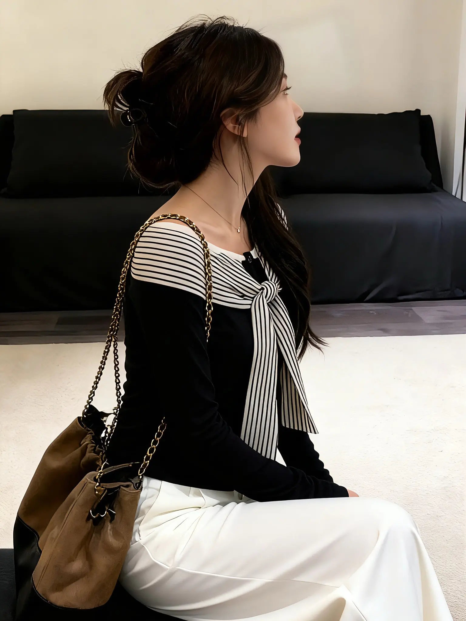 “法式氛围感拉满!黑白条纹蝴蝶结上衣精致又显锁骨,搭配垂感十足的白色阔...