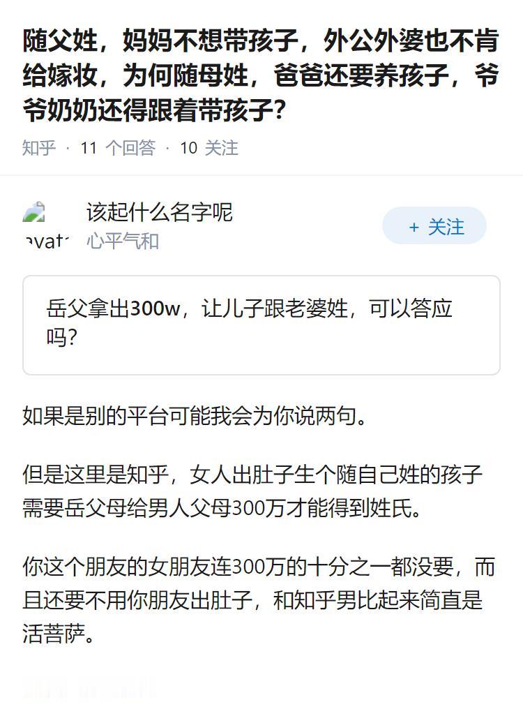 随父姓,妈妈不想带孩子,外公外婆也不肯给嫁妆,为何随母姓,爸爸还要养孩子,爷爷奶奶还得跟着带孩子?