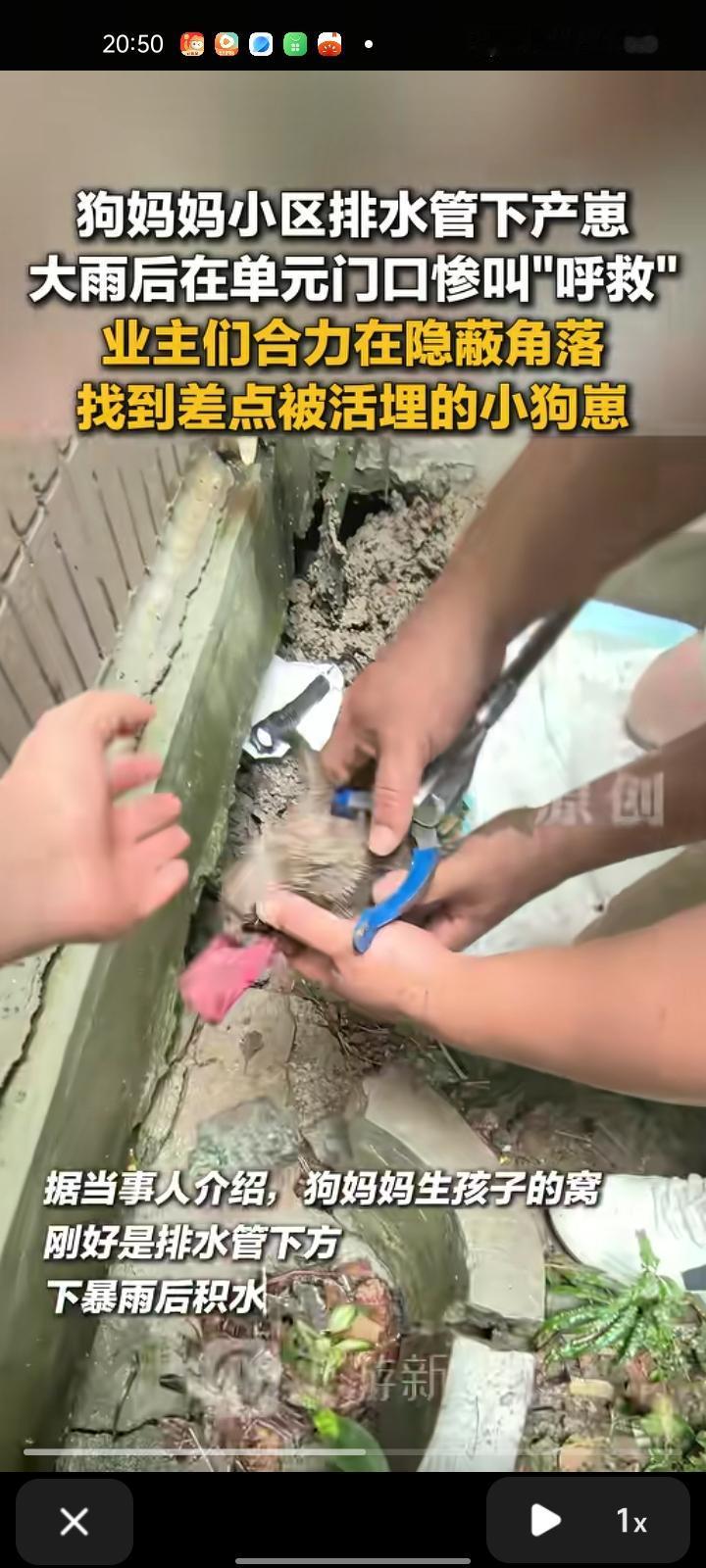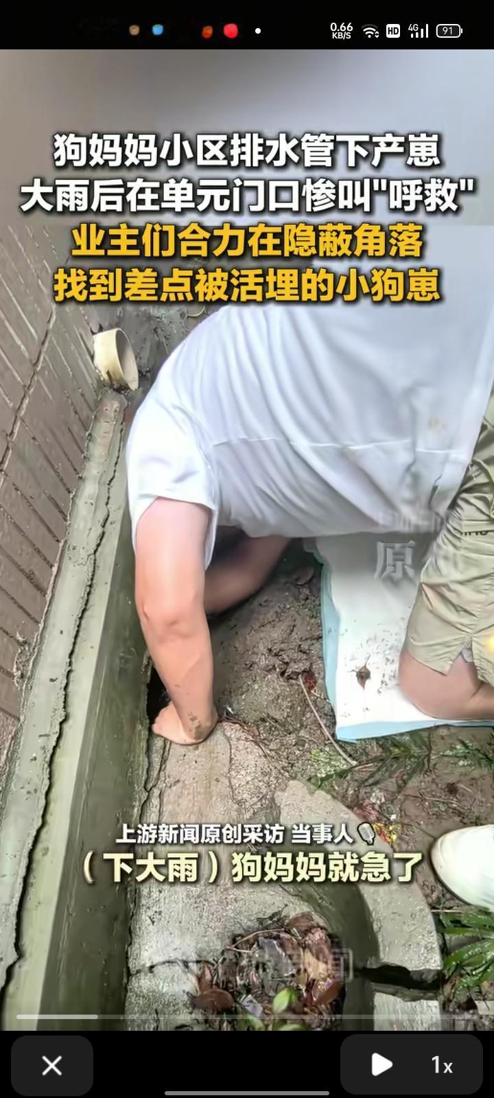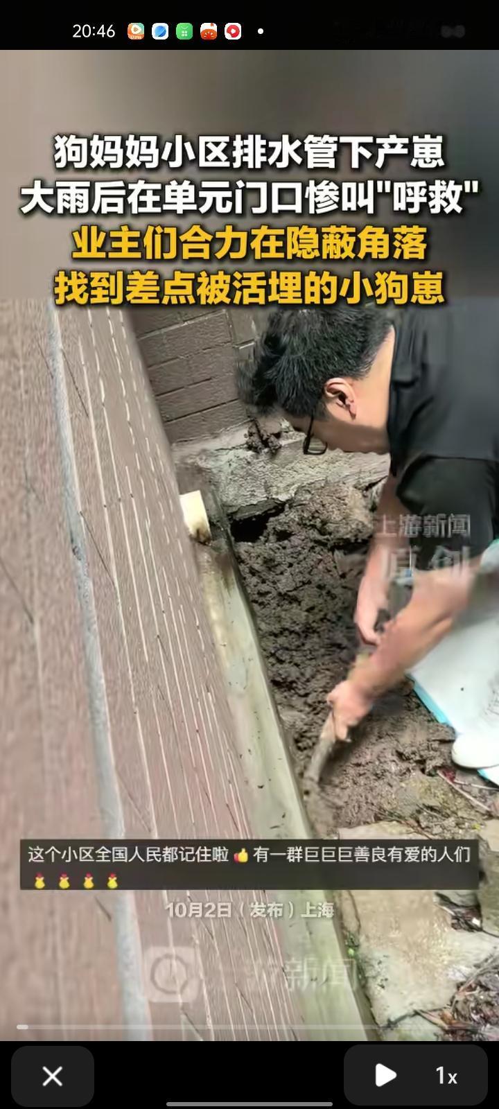 9月30日,上海。狗妈妈在玉兰清苑小区排水管下产崽,大雨后在狗妈妈单元门口惨叫“呼救”。小区业主们收到求助后四处找小狗,大家一起准备垫子、毛巾、夹子、狗粮,最终把小狗们都救出来了。现在大家凑钱把小狗们送往宠物医院,准备找人领养。