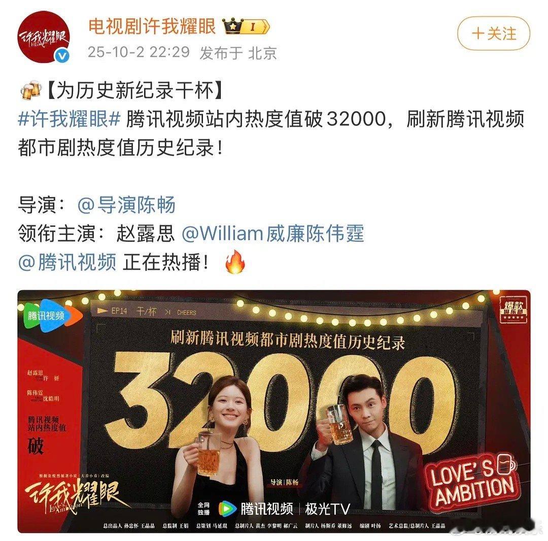 许我耀眼32000海报,这是🐧第一部热度破3w2都市剧吧?其实赵露思还是挺抗剧的