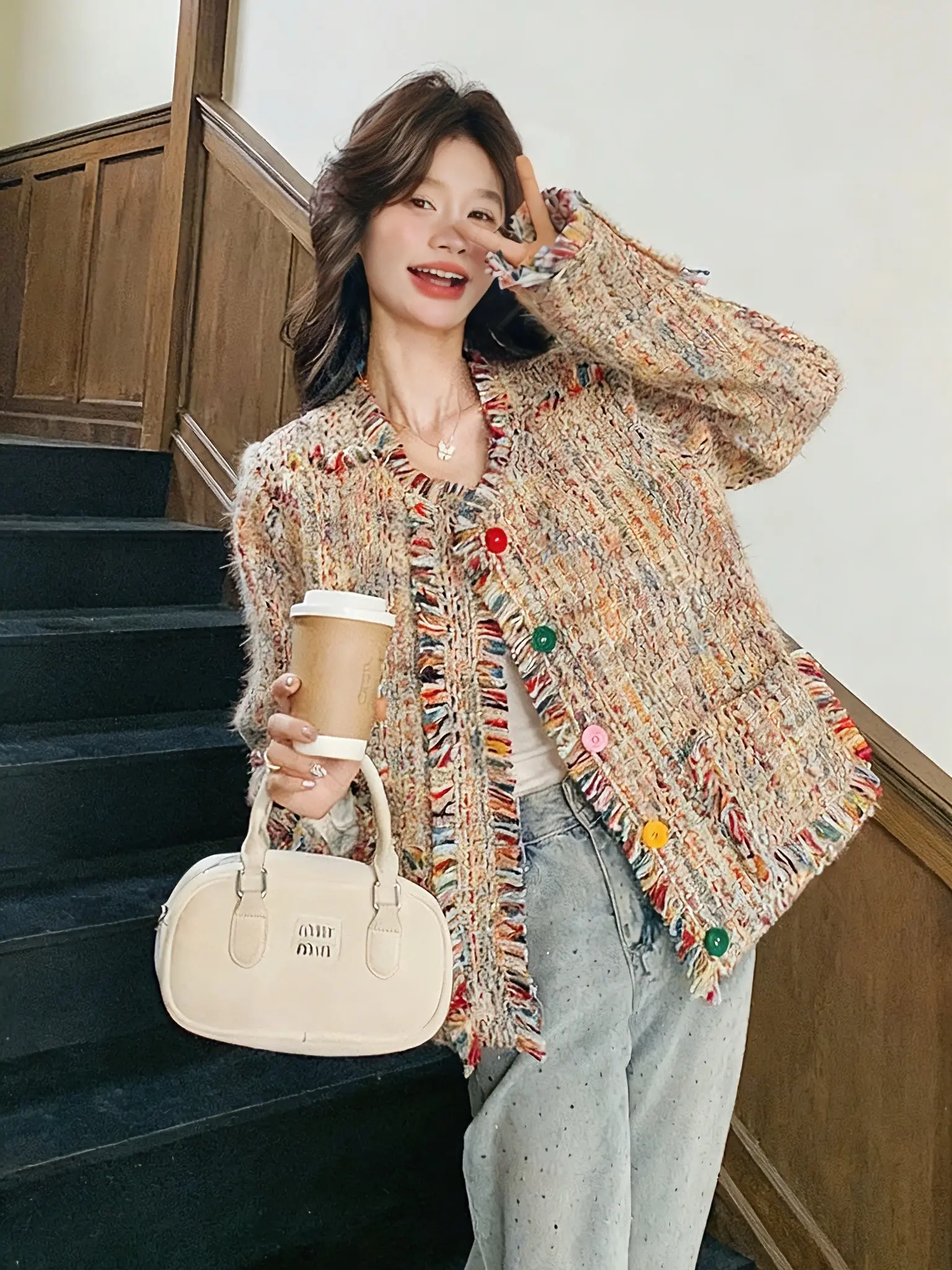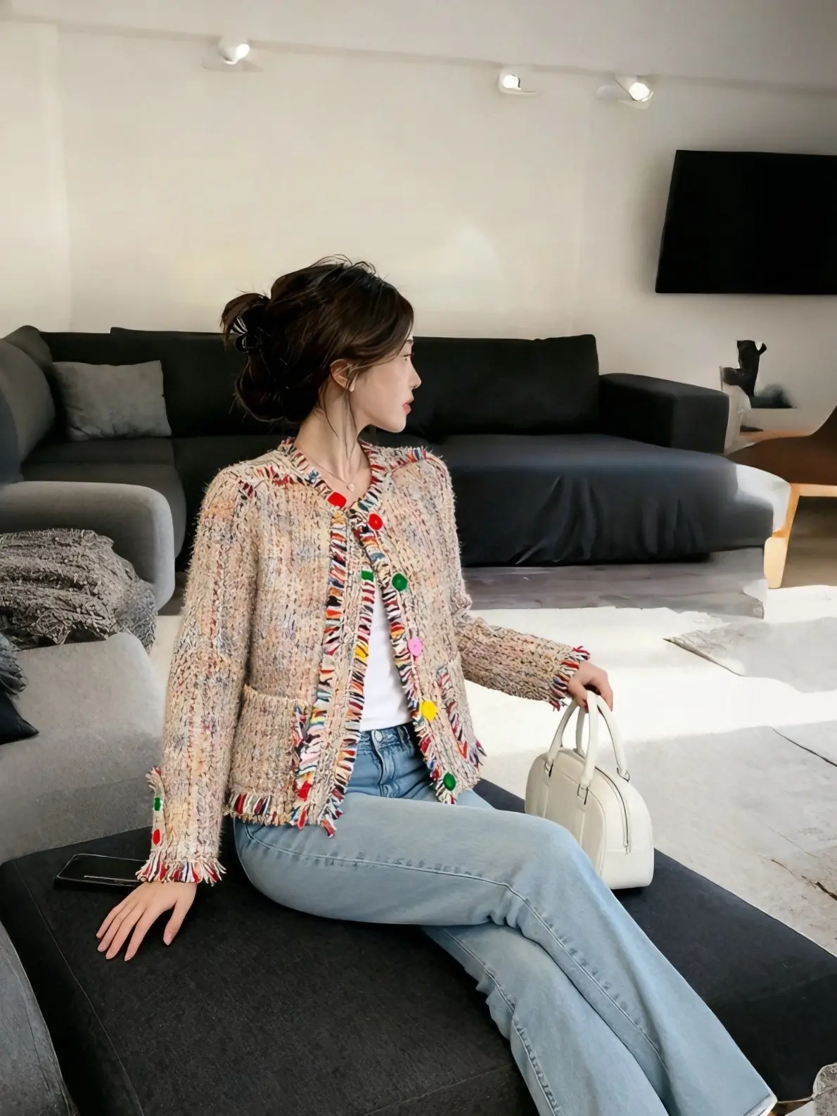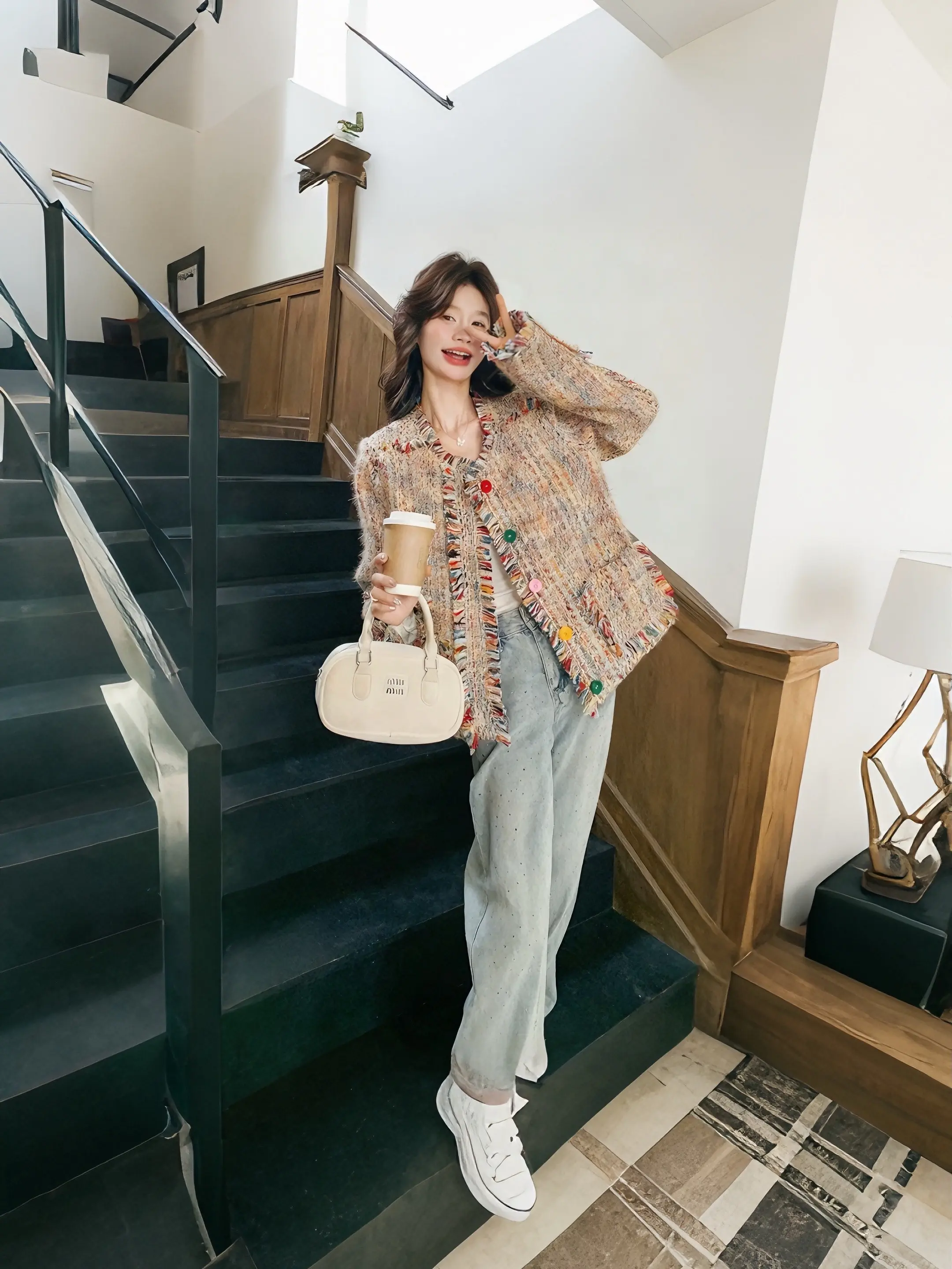 秋日氛围感穿搭被我玩明白了~粗花呢小香风外套混着温柔杂色,流苏边和彩色纽扣把俏皮感拉满