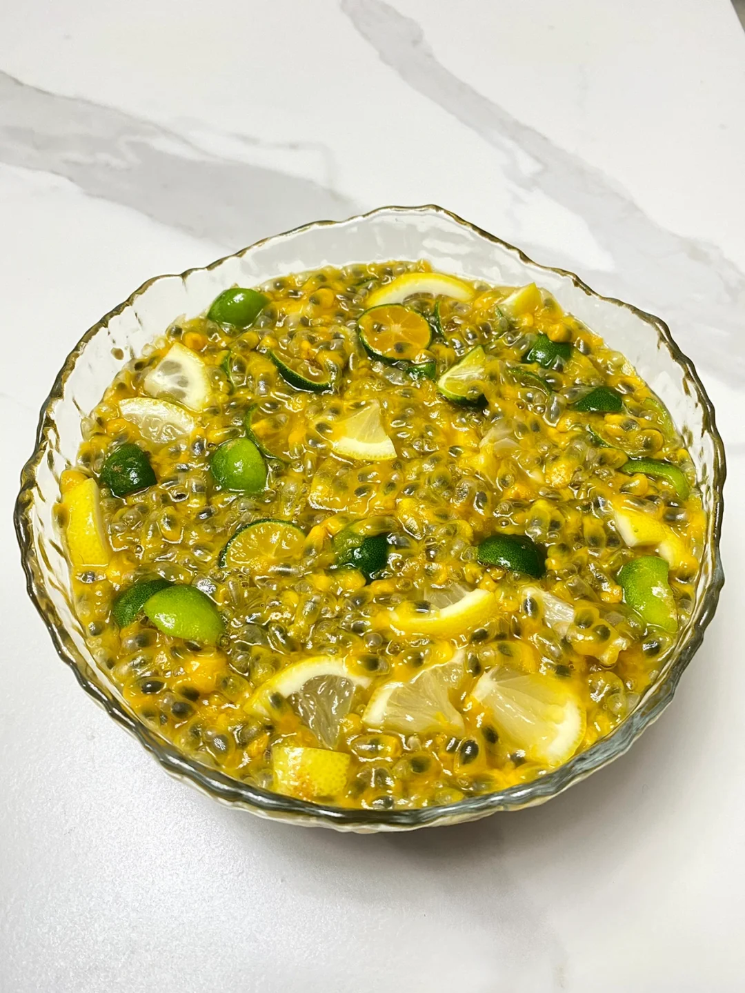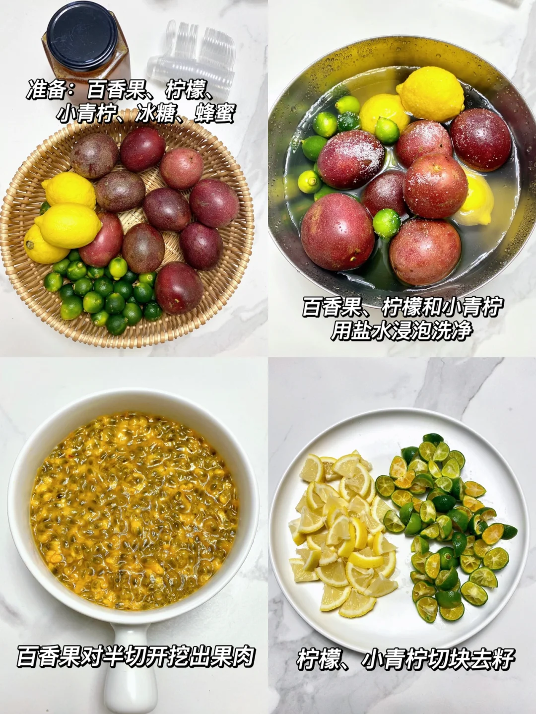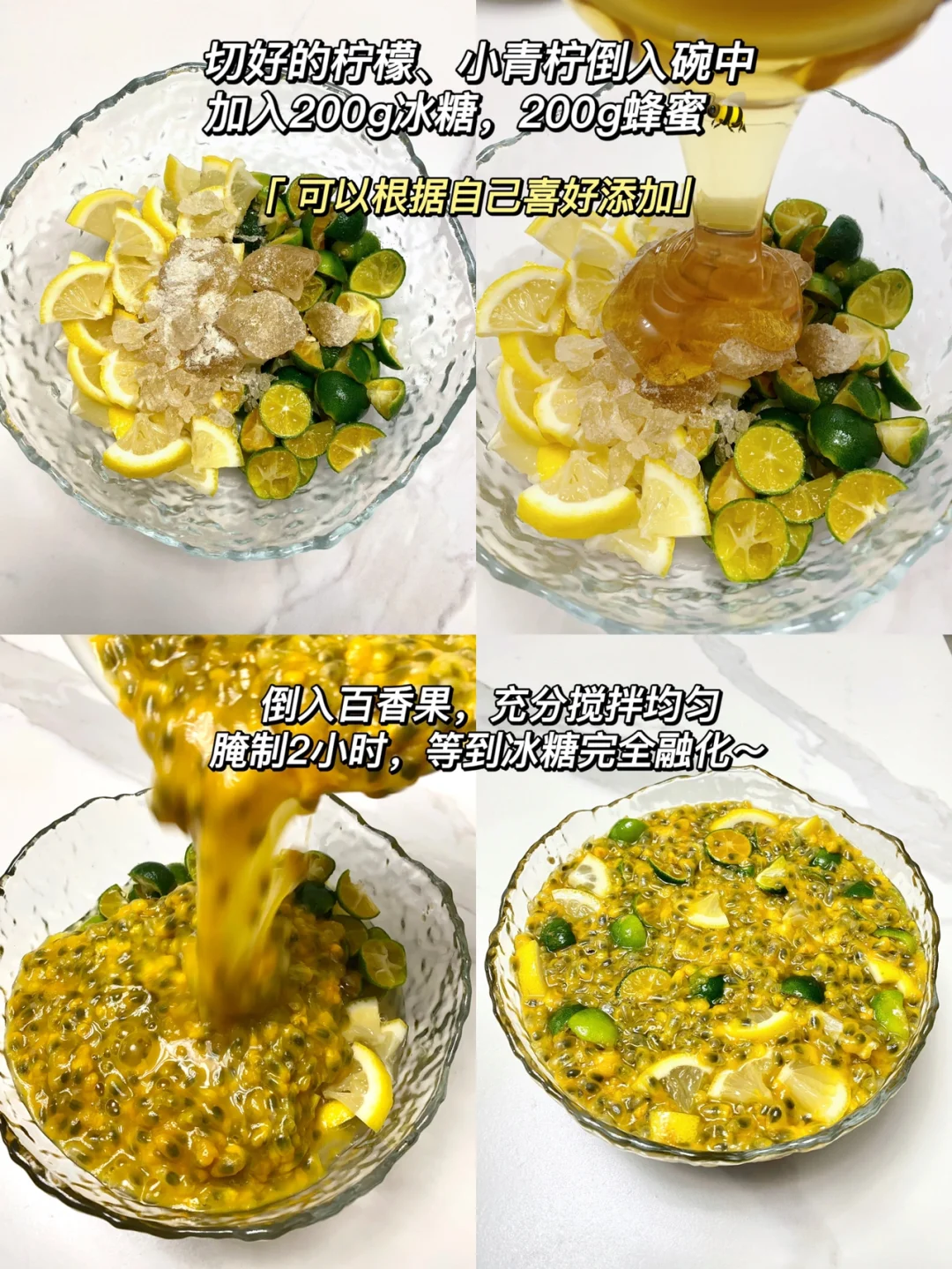 范冰冰章若楠力推❗️超美白养生茶❗️ “美白之王”,VC爆炸💥 先喝一个月,一起变白白! 夏天的较量不能输!!! 📝准备:百香果、柠檬、小青柠、蜂蜜、冰糖 ✅做法:百香果、柠檬和小青柠用盐搓洗干净 晾干水或者擦干水(做的过程不能沾水哦) 百香果对半切开挖出果肉 柠檬小青柠切小块(去籽) 切好的柠檬小青柠倒入一个大碗里,再倒入冰糖、蜂蜜和百香果,充分搅拌均匀,腌制2小时,分装到小盒子里 这简直就是夏天的快乐,酸酸甜甜太好喝了!
