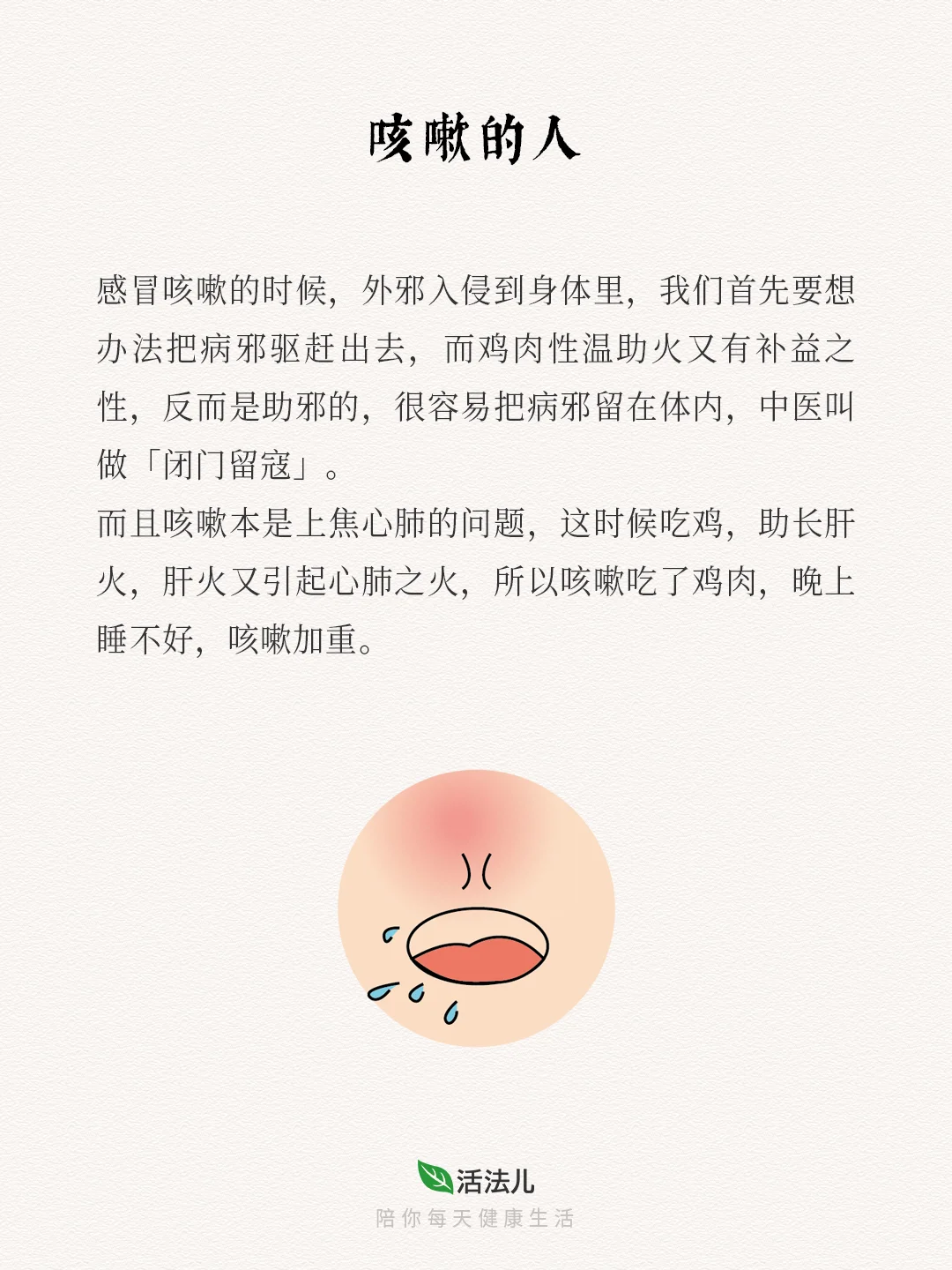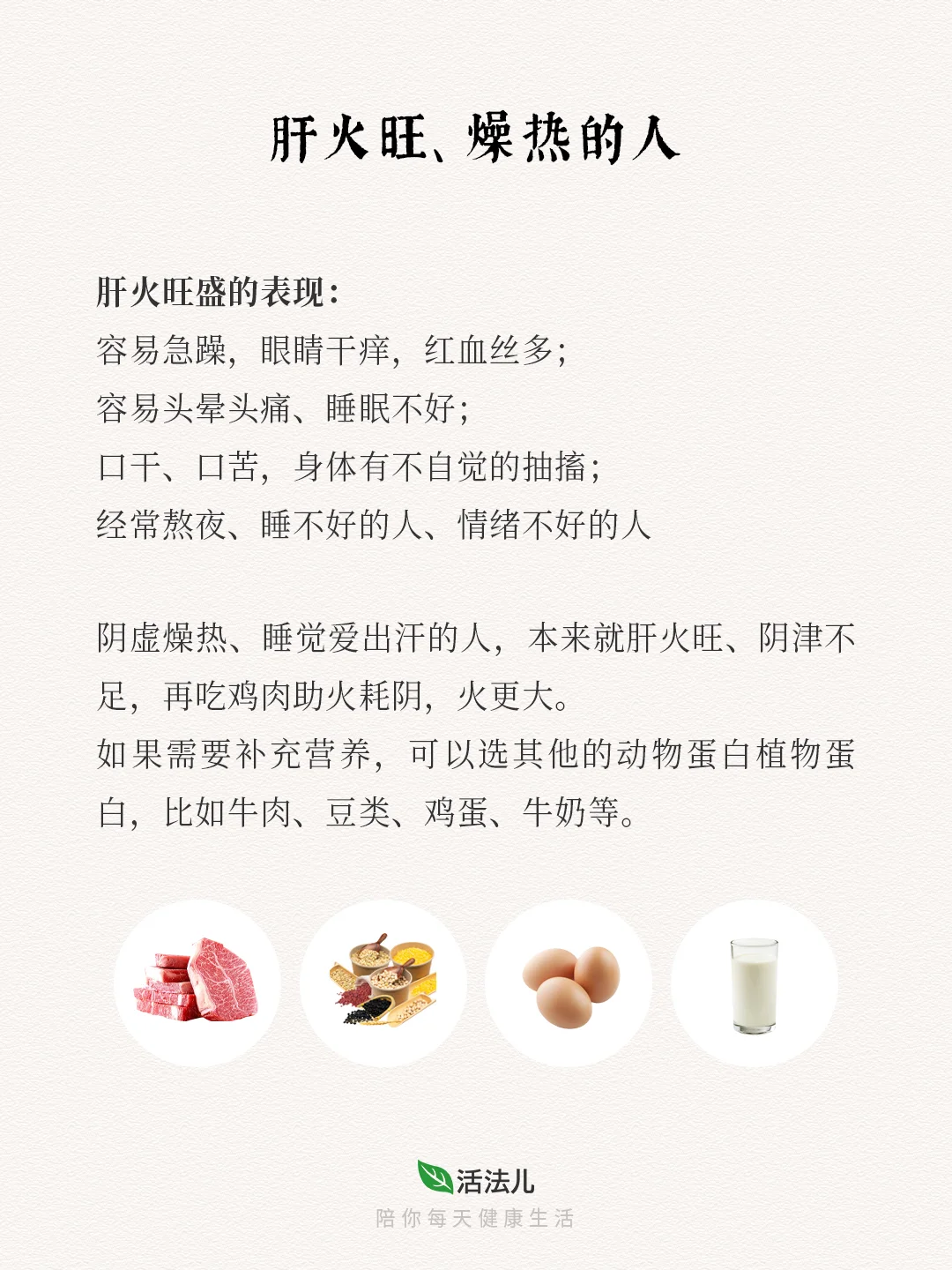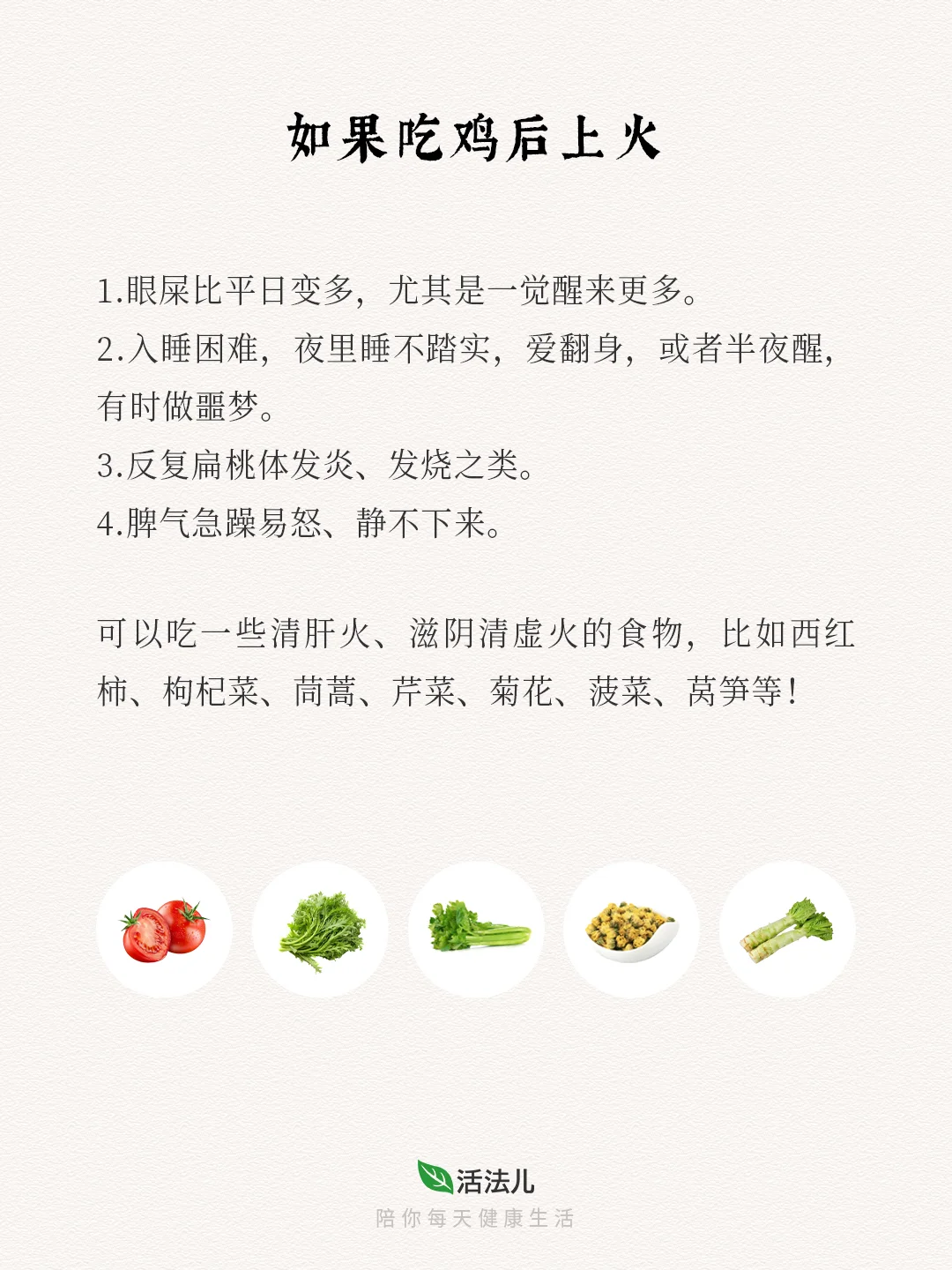 🍃肝火有动的特性,又喜欢向上向外发散,很容易煽动身体埋藏的痰啊、热啊、湿啊,引起上面所说的“火情”!所以,在肝火相对旺盛的春天,吃鸡要慎重,以免招病,尤其是上述4种人!