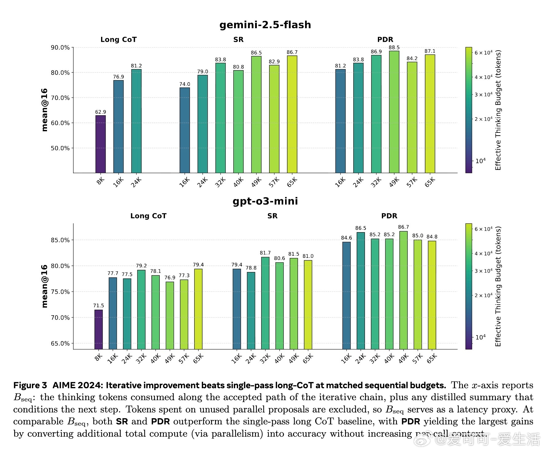 • 本文提出两种迭代改进算子:Sequential Refinement(\SR,单条思路反复打磨)和Parallel-Distill-Refine(\PDR,批量生成多解→压缩成摘要→基于摘要优化),后者可通过并行计算转换更多总计算量为准确率提升,同时保持单次上下文长度恒定。