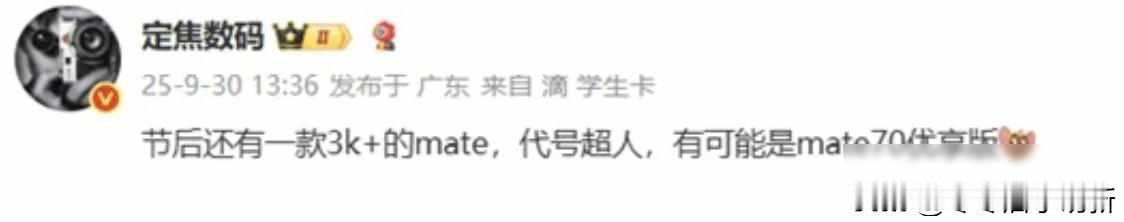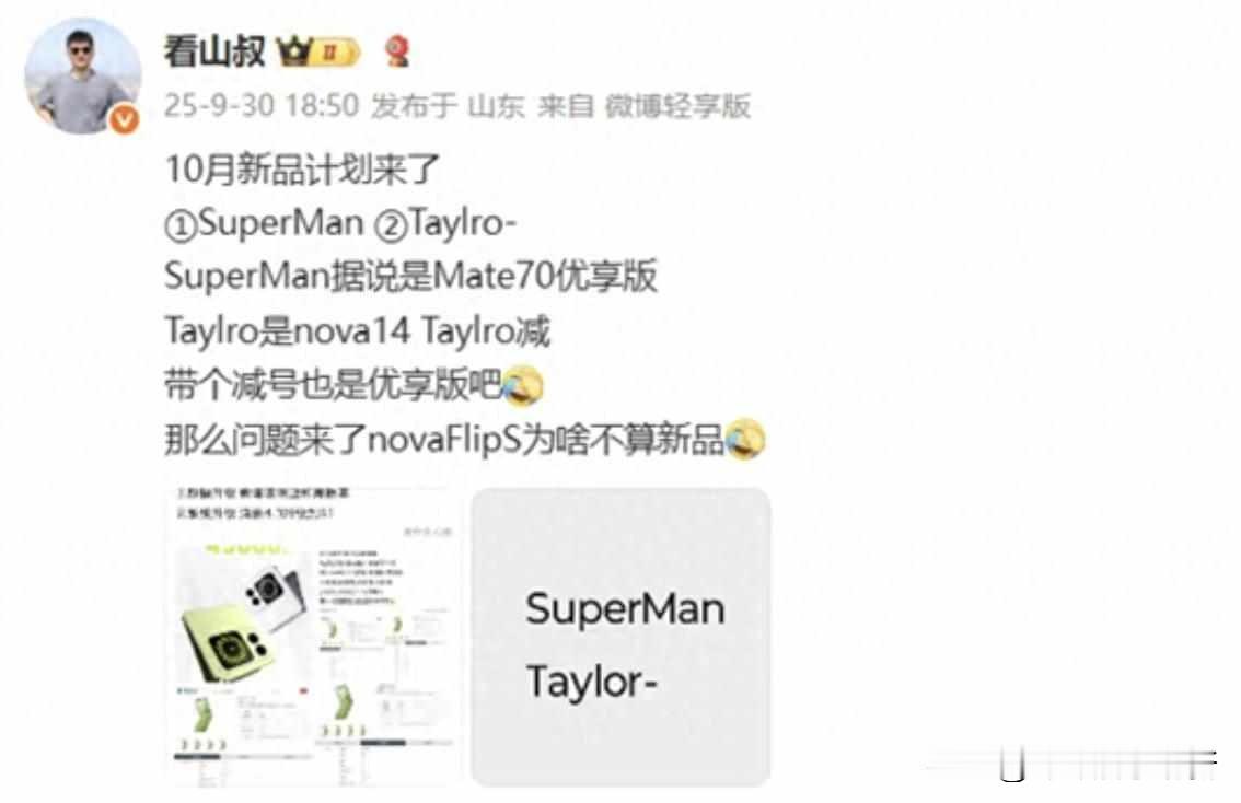 华为新机要卖3000?芯片降频却配旗舰屏,用户买账吗? 最近有博主说华为十月要出两款新手机,一个叫SuperMan,可能是Mate 70的低配版,另一个叫Taylro-,像是nova 14的简化款,SuperMan据说起步价三千块,比标准版便宜一千多,这价格真有点出人意料,毕竟华为平时没这么便宜过。 它用的芯片不是最强的,可能是麒麟9020A或者9010B,性能调低了一点,屏幕还是6.7英寸的高刷OLED,玻璃是第二代昆仑,拍照有5000万主摄加上长焦,电池大小没变,充电速度也一样,系统直接是鸿蒙5.0,用起来不会差,不是偷工减料,就是把钱省在芯片上,别的地方该有的都有。 现在iPhone 16起步五千多,安卓也都在往高端冲,华为反着来,三千块做中端,不是不想做高端,是芯片产能跟不上,干脆用降频版撑住产量,目标很明确,想买好手机又不想花太多钱的人。 鸿蒙5.0让系统更省资源,芯片慢点也不卡,北斗卫星消息和星闪技术都留着,这是华为独有的本事,荣耀主打便宜,华为这边靠的是科技感和性能下放,俩人走的路不一样。 不过这些消息还没官方确认,麒麟9010B到底有没有,还是只是温控改了改,得等真机出来才说得准,三千块要是真能卖,肯定能把vivo S和荣耀X系列的买家拉走,但线下店能不能扛住这个价,还得看后面怎么操作。