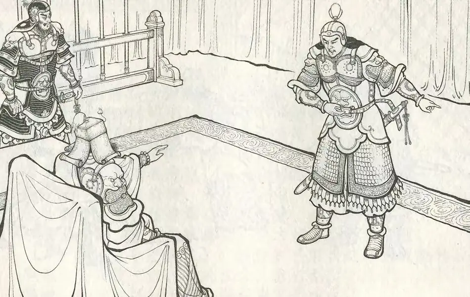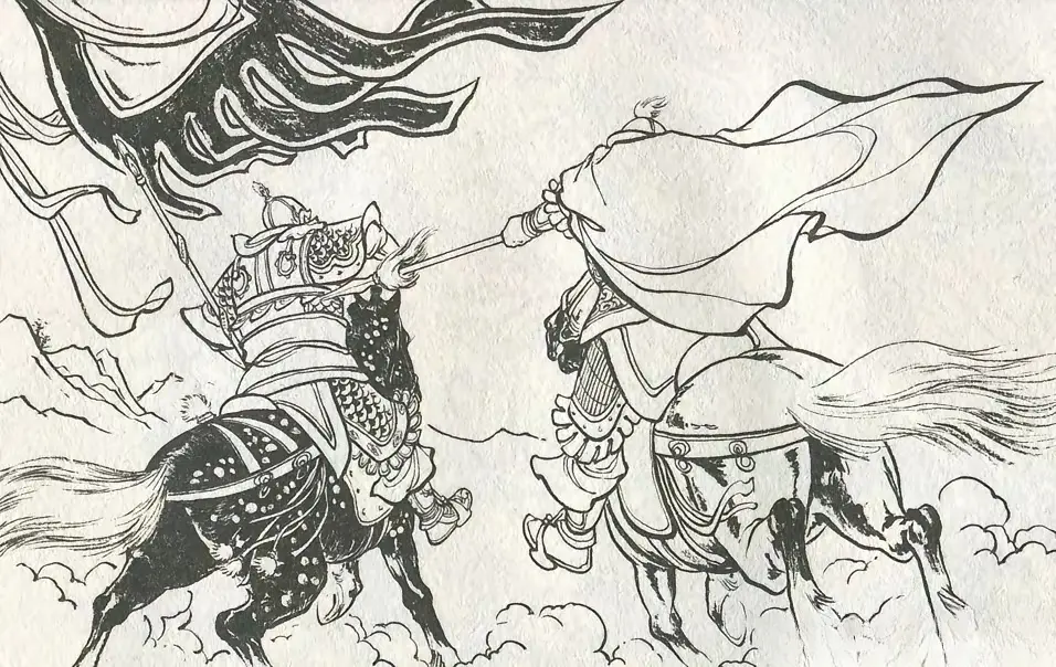 偷放暗箭。这幅图中有三个主要人物,其中两人正在单挑,经过一番激烈交锋...