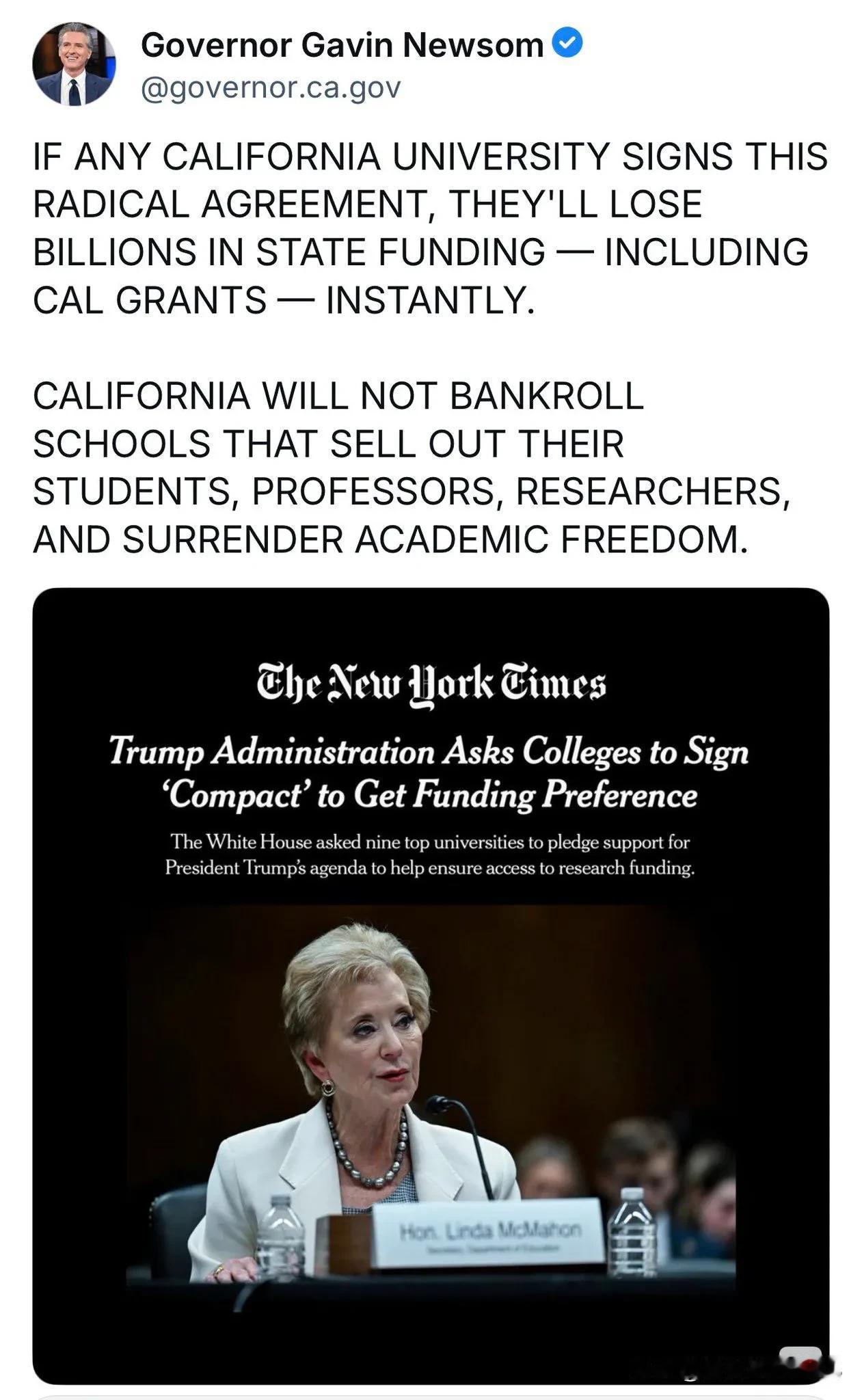 加州州长纽森警告加州高校不要和川普当局签署保证遵循川普教育政策的协议:“如果任何一所加州的大学签署这项激进协议,他们将立即损失数十亿美元的州政府资金。加州不会资助那些出卖学生、教授、研究人员并放弃学术自由的学校。”他还应该宣布如果他当上总统,任何和川普签协议的大学都将丧失联邦经费。