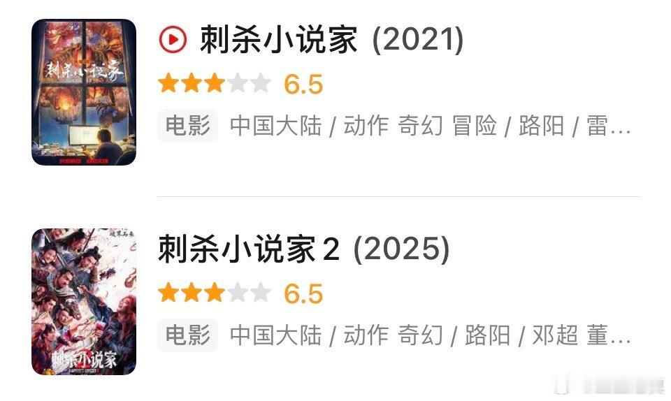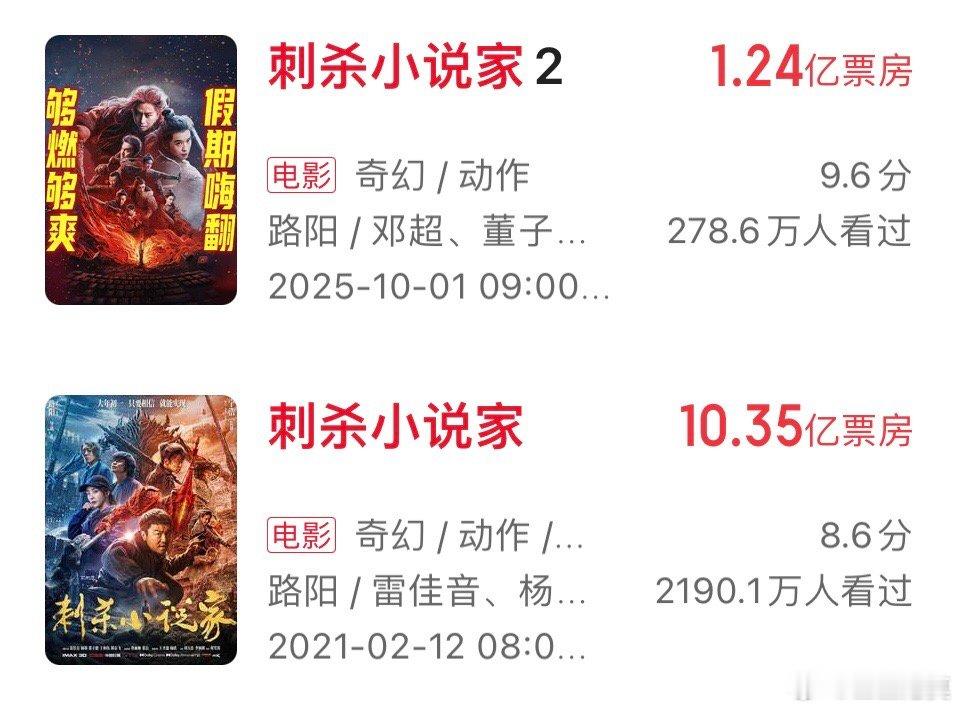 《刺杀小说家2》预测票房从7.23亿降至5.05亿。今天晚上大概率还会继续下调。最终票房有可能4亿出头,将不及第一部的一半(《刺杀小说家》票房10.35亿)。《刺杀小说家》第一部、第二部豆瓣评分都是6.5分。但第二部可能还会继续下滑。第一部三位主角分别是雷佳音、杨幂、董子健。第二部三位主角分别是邓超、董子健、雷佳音。导演都是路阳。