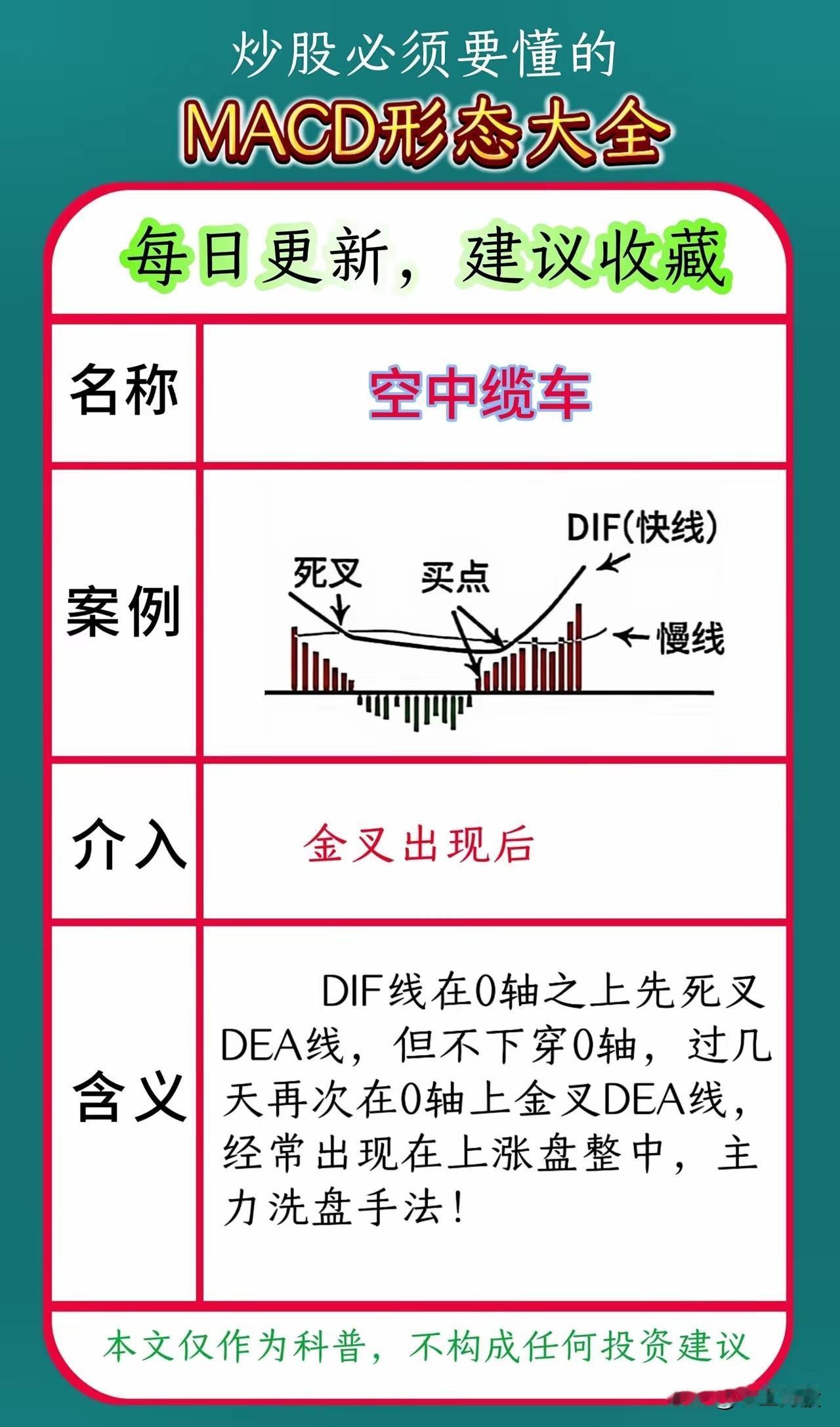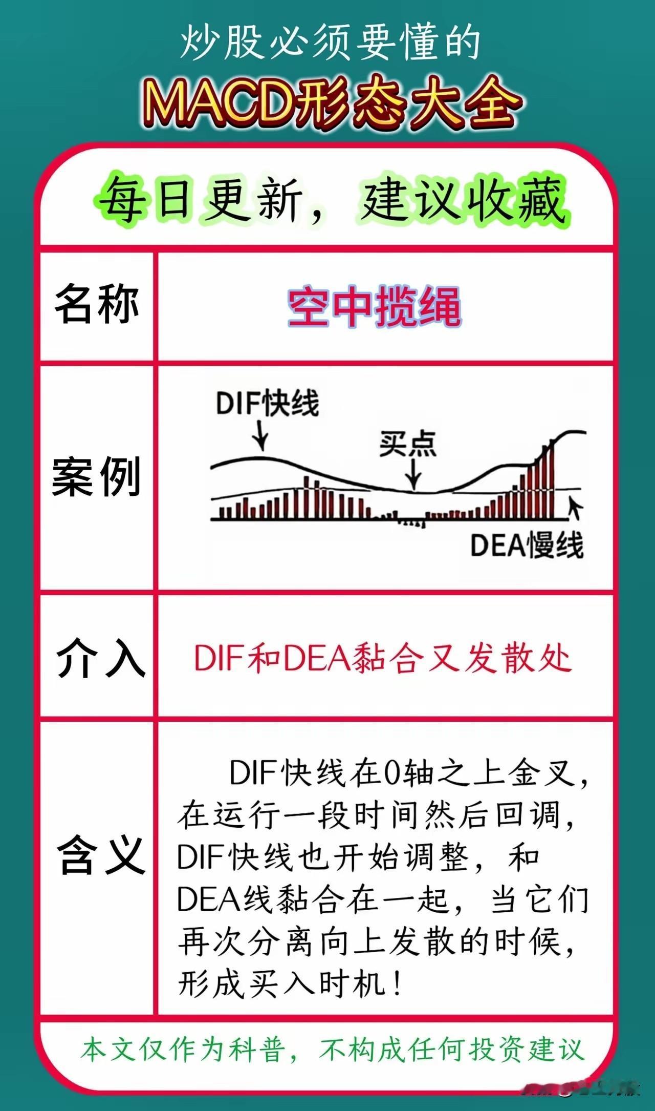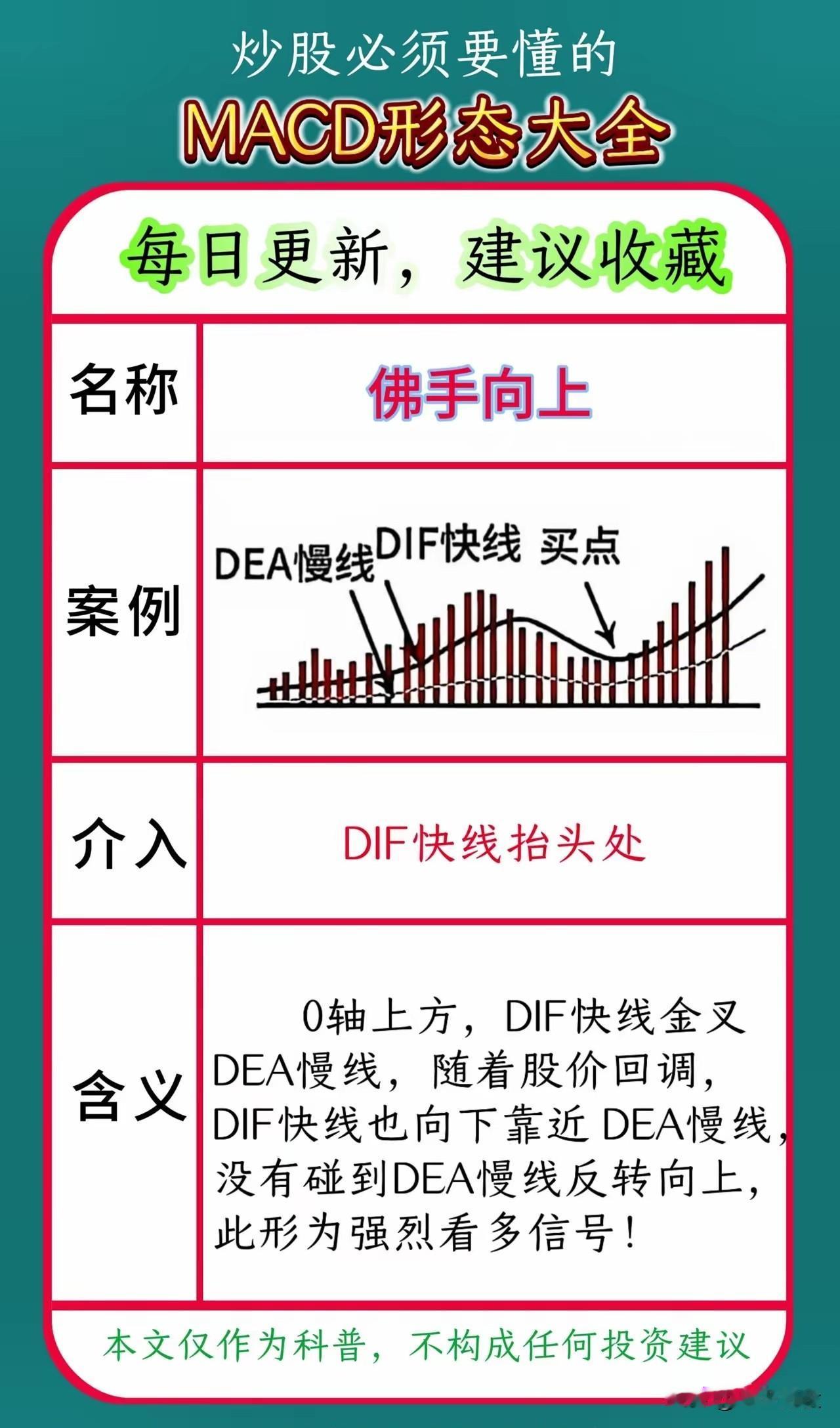 以下是关于股票技术分析中MACD指标常见形态的科普,包括: 1. 海底电缆:0轴下方,DIF与DEA长时间黏合后向上发散,为买入信号。 2. 天鹅展翅:0轴下方,DIF上穿DEA未破0轴即回调,随后再次向上且红柱变长,可介入。 3. 空中缆车:0轴上方,DIF先死叉DEA后再金叉,常为主力洗盘,金叉后可关注。 4. 小鸭出水:0轴下方,DIF金叉DEA后回调再死叉,探底后DIF再次金叉,为买入时机。 5. 海底捞月:0轴下方,DIF二次金叉,预示底部完成,可择机入场。 6. 空中揽绳:0轴上方,DIF金叉后回调与DEA黏合再发散,为买入时机。 7. 佛手向上:0轴上方,DIF金叉DEA后回调不破再向上,是强烈看多信号。 8. 漫步青云:0轴上方,DIF与DEA死叉后不破0轴再金叉,预示股价探底回升。 所有内容仅供科普参考,不构成投资建议。