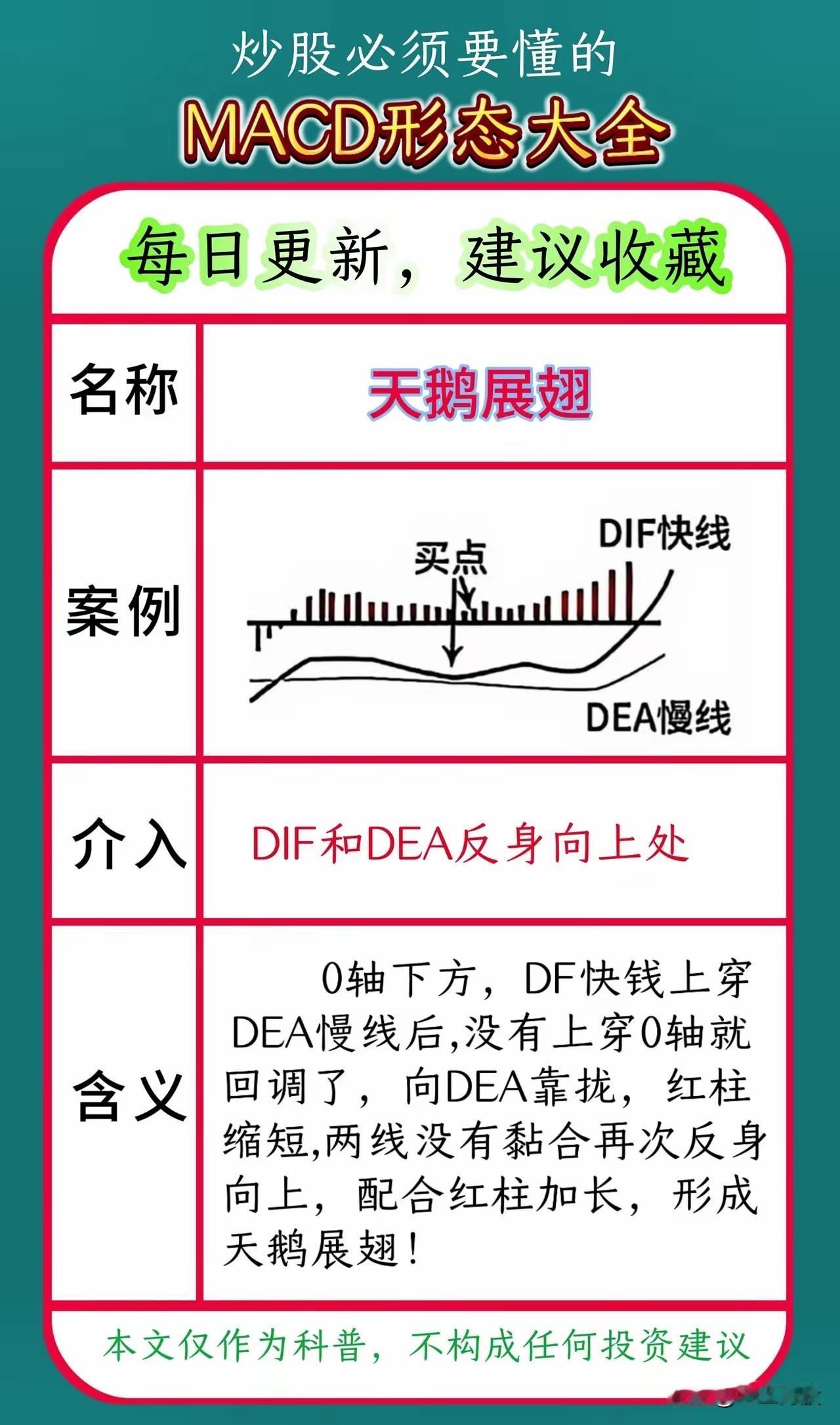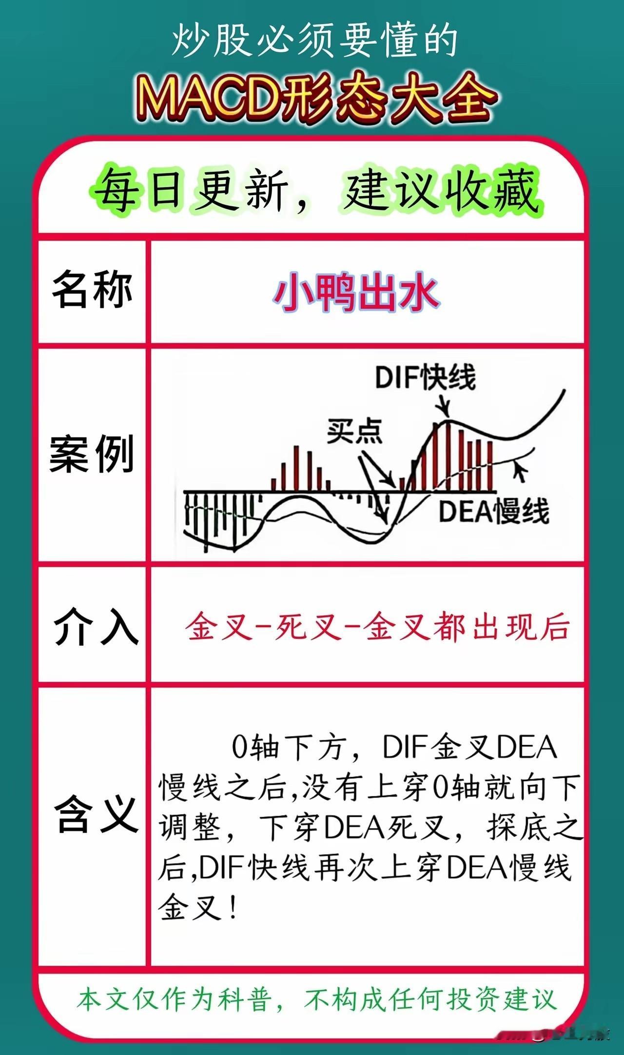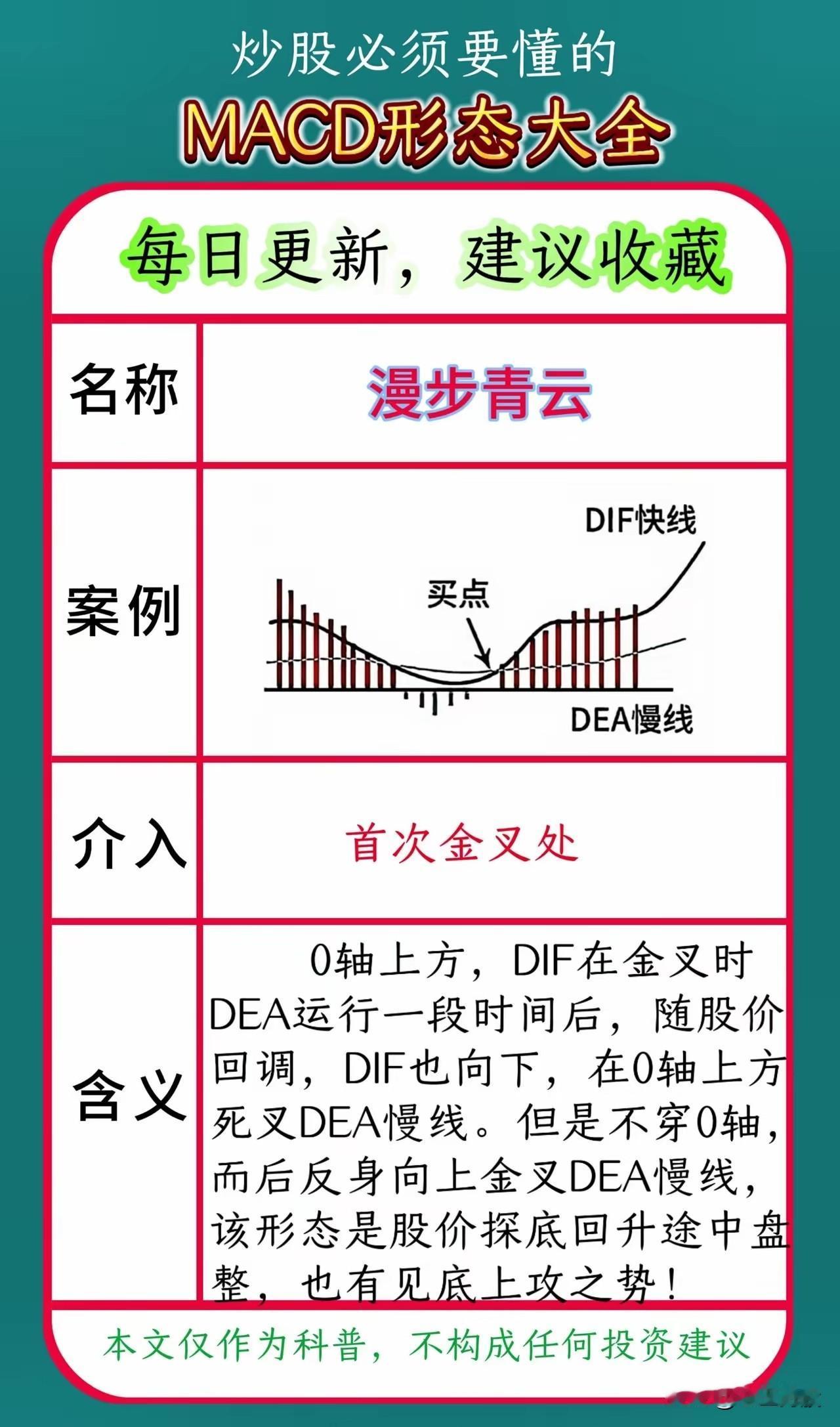 以下是关于股票技术分析中MACD指标常见形态的科普,包括: 1. 海底电缆:0轴下方,DIF与DEA长时间黏合后向上发散,为买入信号。 2. 天鹅展翅:0轴下方,DIF上穿DEA未破0轴即回调,随后再次向上且红柱变长,可介入。 3. 空中缆车:0轴上方,DIF先死叉DEA后再金叉,常为主力洗盘,金叉后可关注。 4. 小鸭出水:0轴下方,DIF金叉DEA后回调再死叉,探底后DIF再次金叉,为买入时机。 5. 海底捞月:0轴下方,DIF二次金叉,预示底部完成,可择机入场。 6. 空中揽绳:0轴上方,DIF金叉后回调与DEA黏合再发散,为买入时机。 7. 佛手向上:0轴上方,DIF金叉DEA后回调不破再向上,是强烈看多信号。 8. 漫步青云:0轴上方,DIF与DEA死叉后不破0轴再金叉,预示股价探底回升。 所有内容仅供科普参考,不构成投资建议。