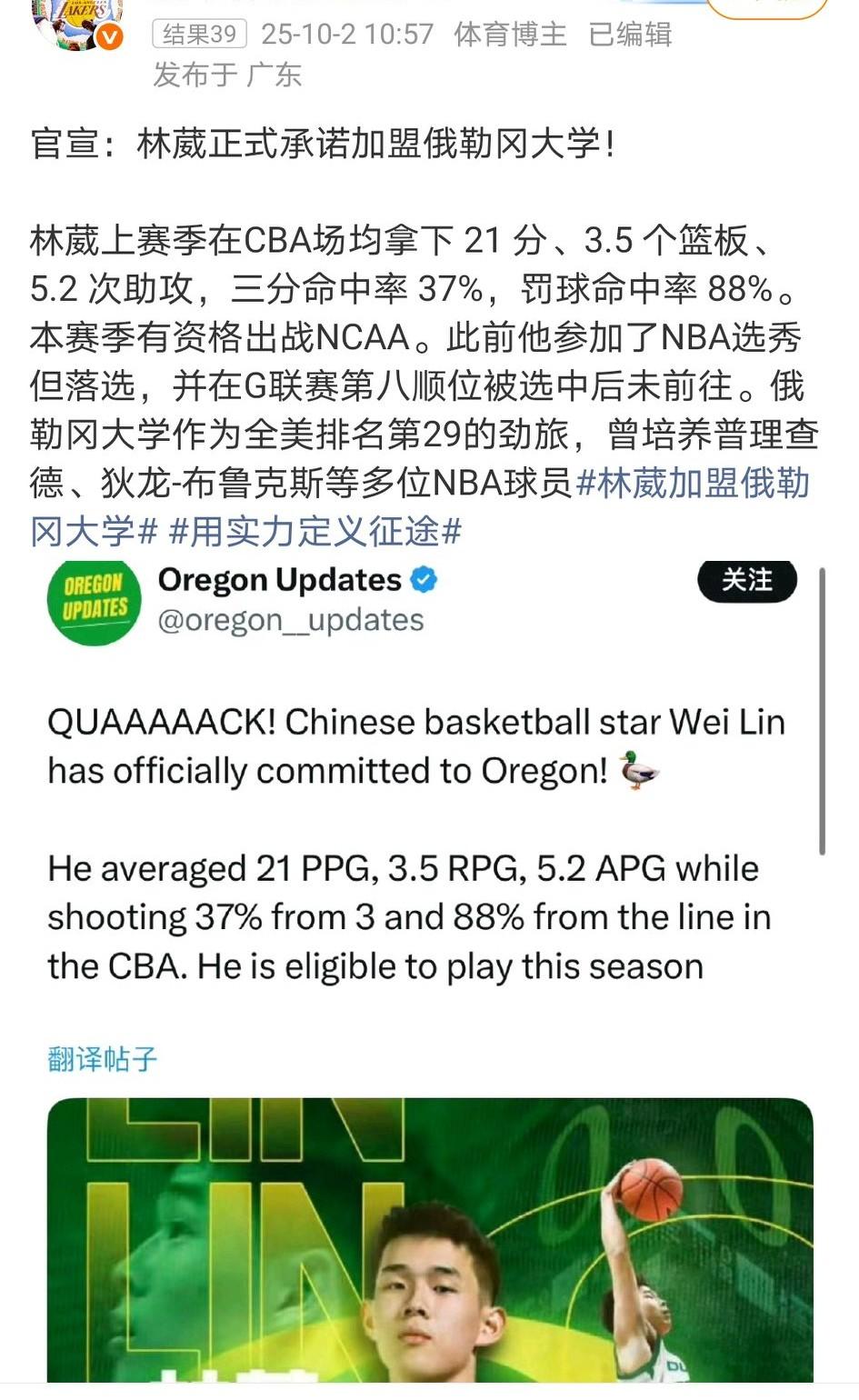 不愿躺平的CBA新星!新赛季林葳加盟NCAA俄勒岗大学,他应该是首位打过CBA再