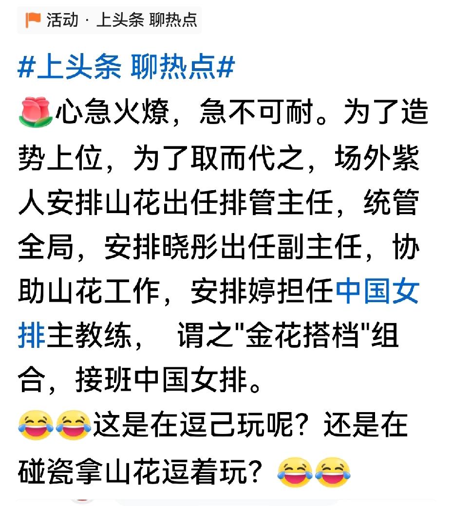 [玫瑰][玫瑰][玫瑰]场外紫人“组织”安排山花担任排管中心主任,还组建自宣了“三花搭档”,让其接班中国女排(详见截图一)。 这般制造话题、带偏节奏,散布虚假信息,故意煽风点火、混淆视听以博流量,还碰瓷山花、拿山花取乐的行径,着实令人不齿。 山花晋升
