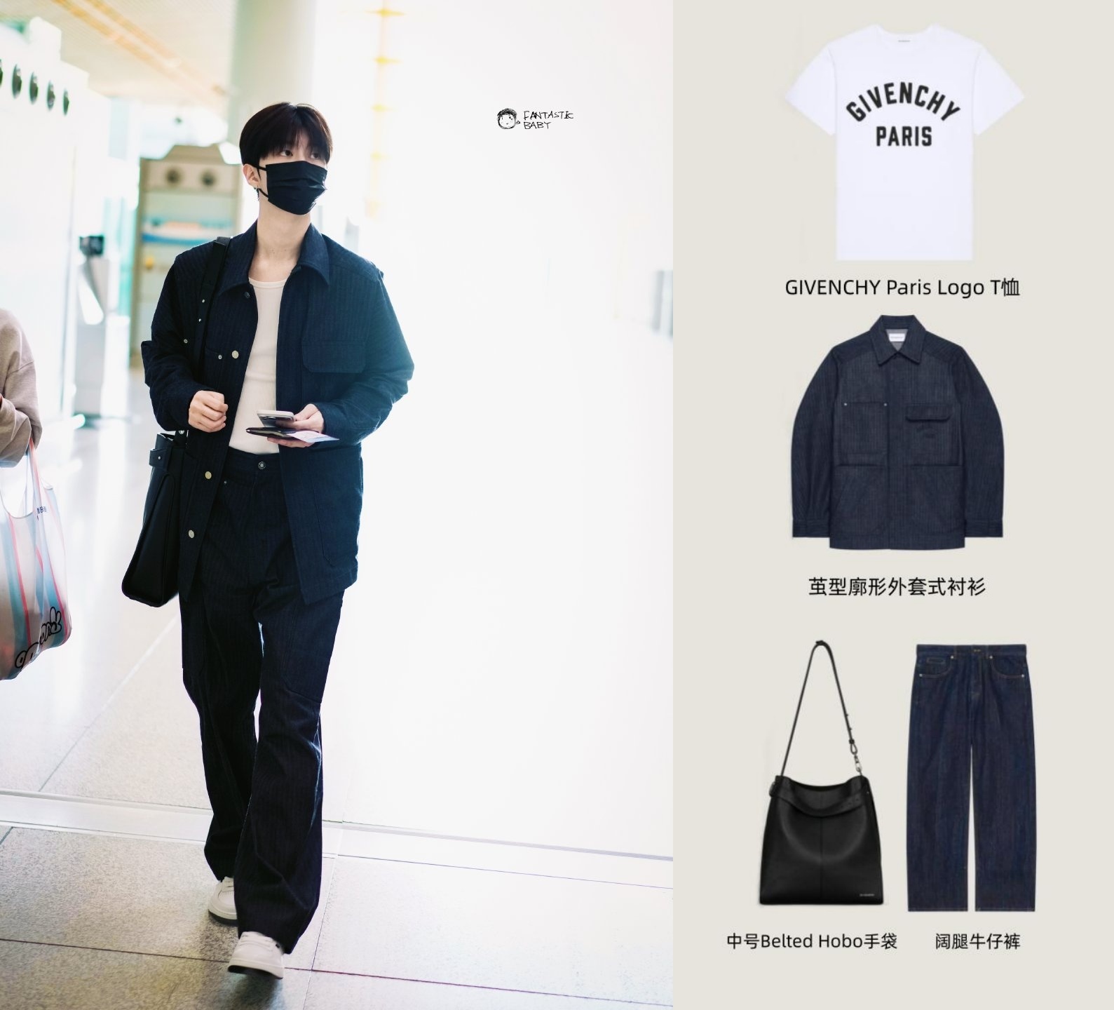 范丞丞机场造型选择纪梵希茧型廓形外套式衬衣,搭配阔腿牛仔裤及光滑柔软的Belted Hobo手袋,随性又不失格调,戴上口罩也掩盖不住的少年感。