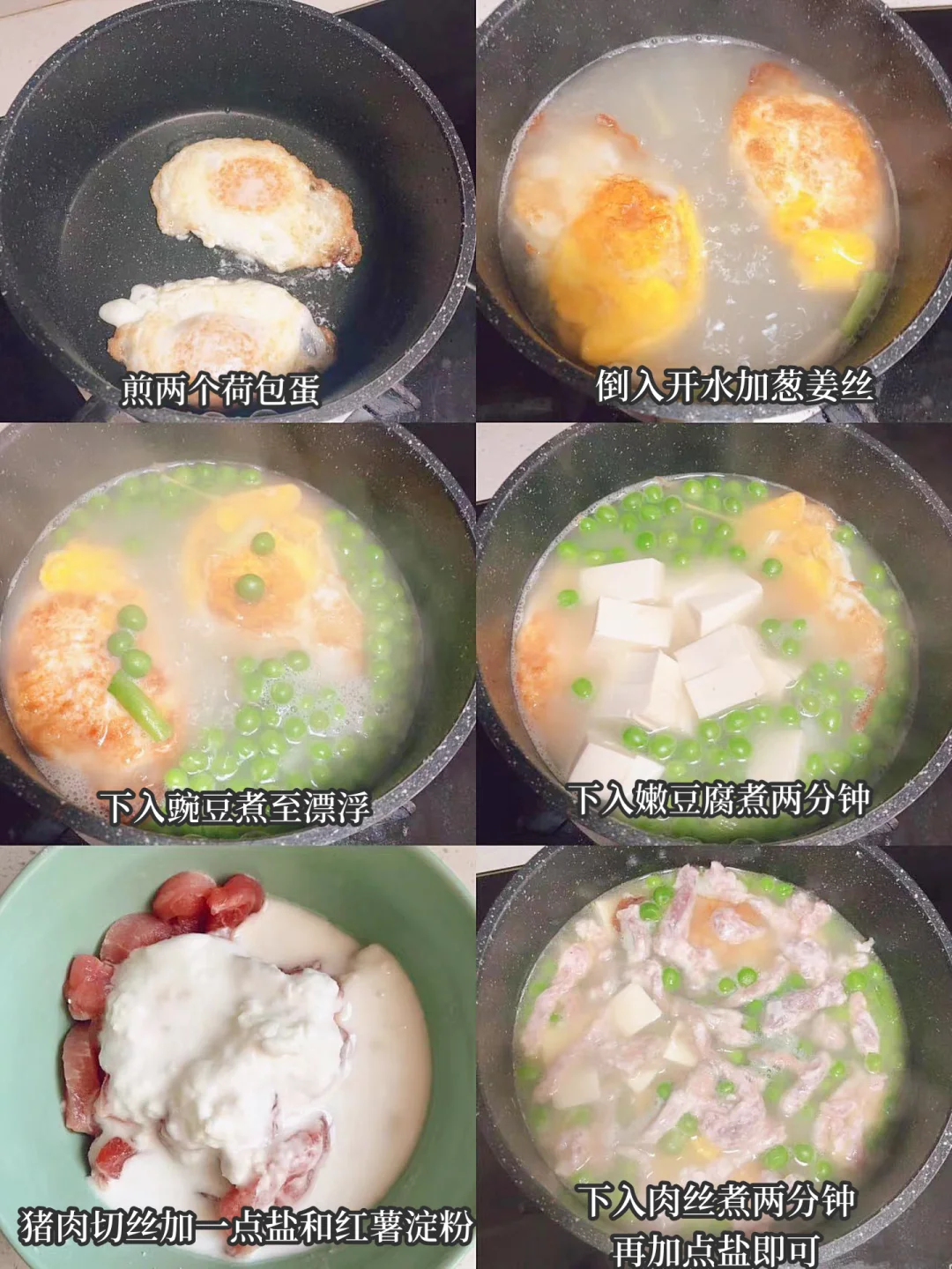 1⃣️先煎两个荷包蛋,煎好后倒入开水,加一点葱姜丝
