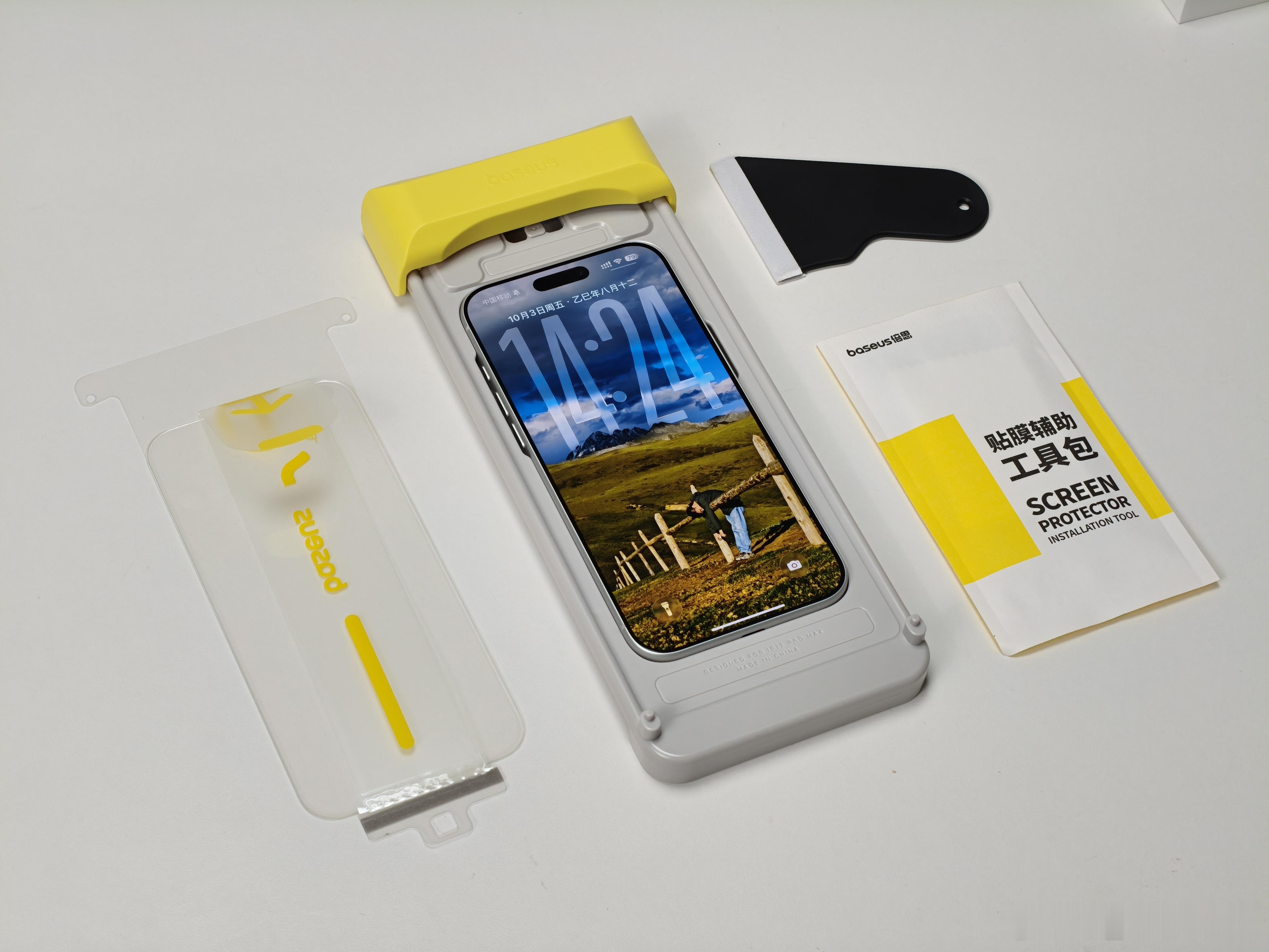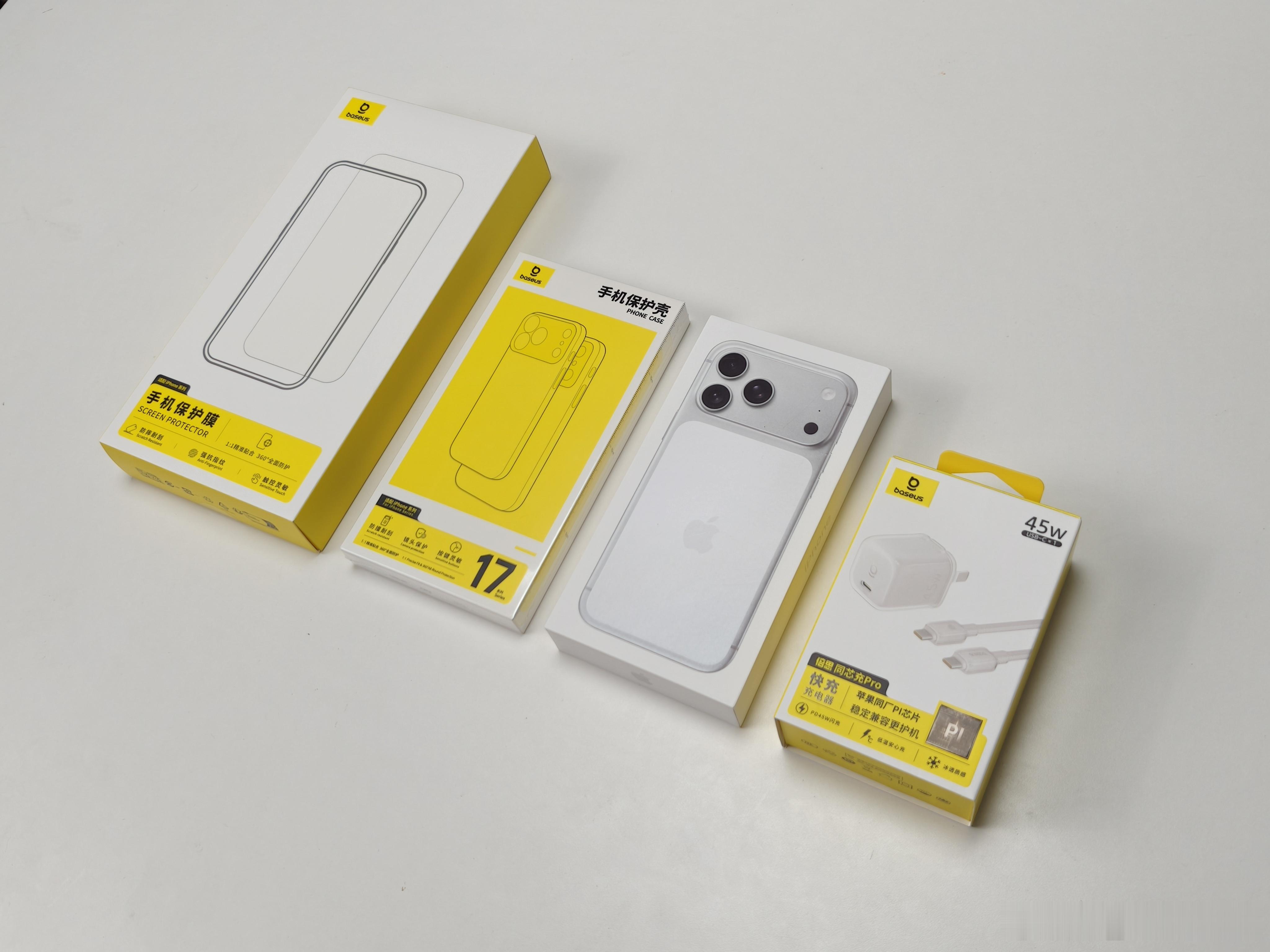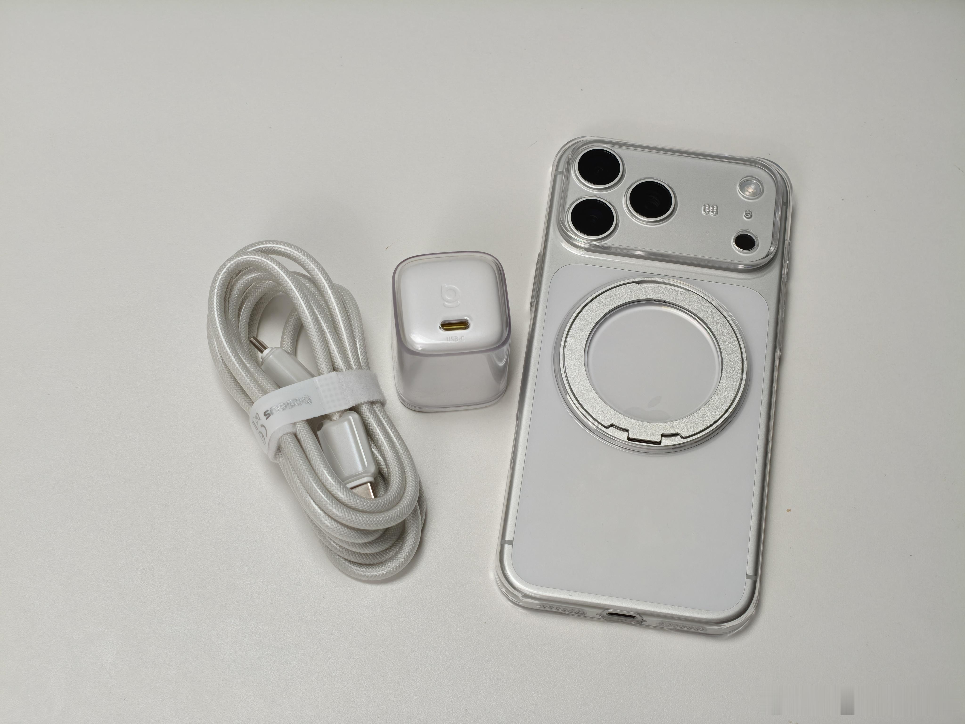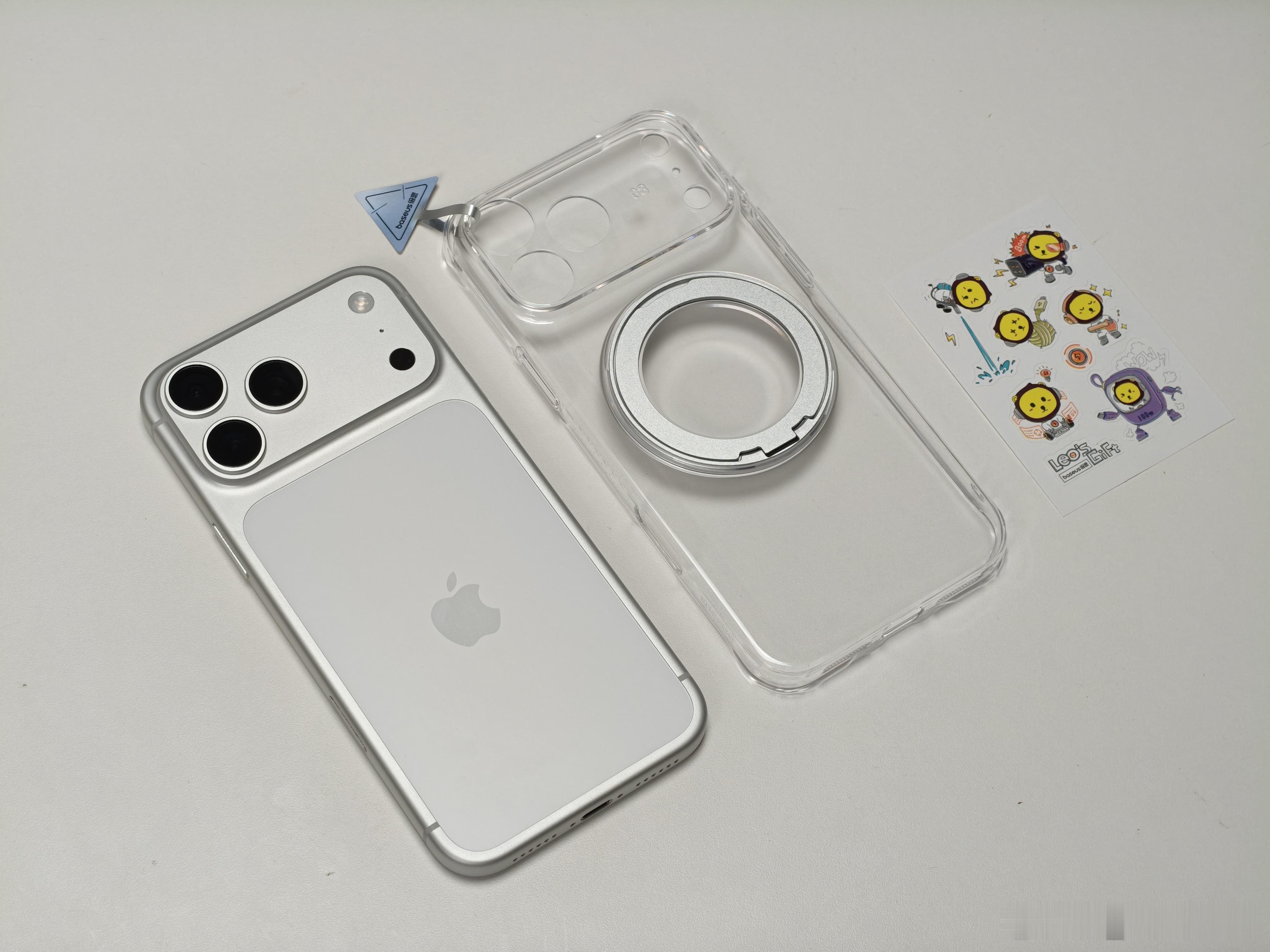 看看我的苹果手机搭子,直接给我的iPhone17 Pro Max来了个倍思全家桶。先说这个壳,虽然是透明硬壳,但手感还不错,对于手机包裹的也很好,细节的地方是四周做了加固,还有支架设计;膜算是比较惊喜的,给了各种贴膜工具,还会提醒你贴之前要看视频,操作也很简单。贴完仔细看了看,这张膜弧面边缘控制的很不错,可以说是那种无感膜了;充电头也是这种透明设计风格,体积小巧并且插头可折叠,最高45W PD快充,你们感觉咋样[doge]